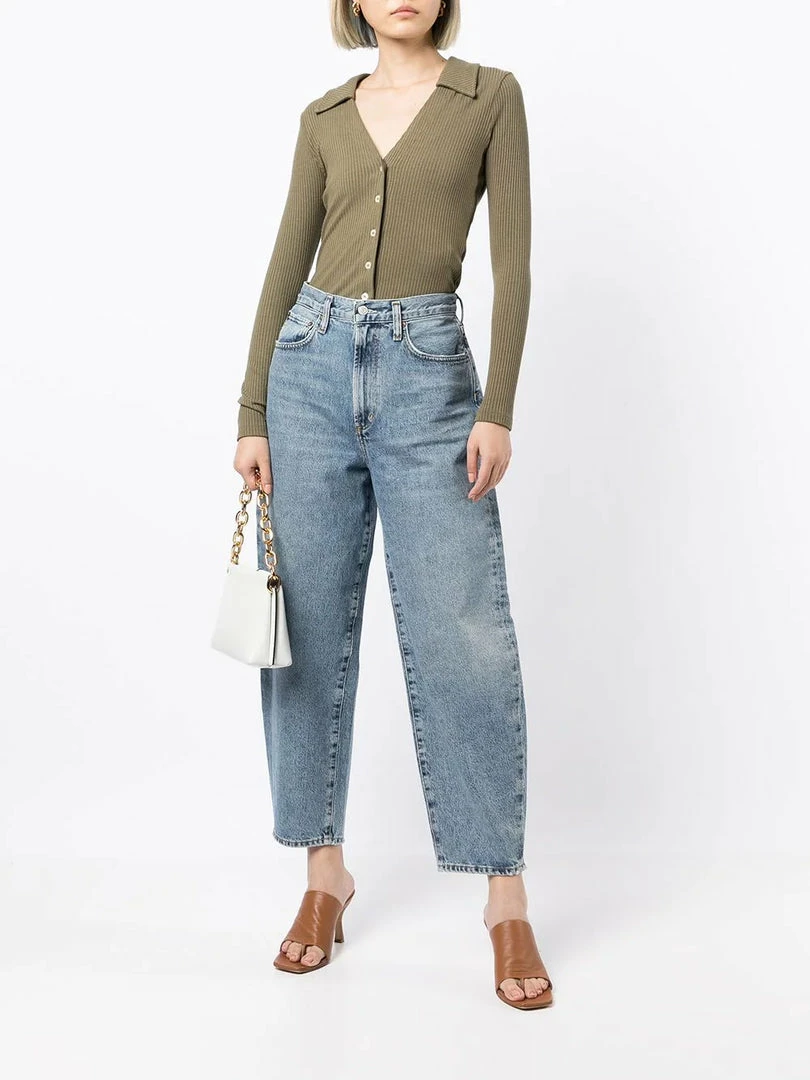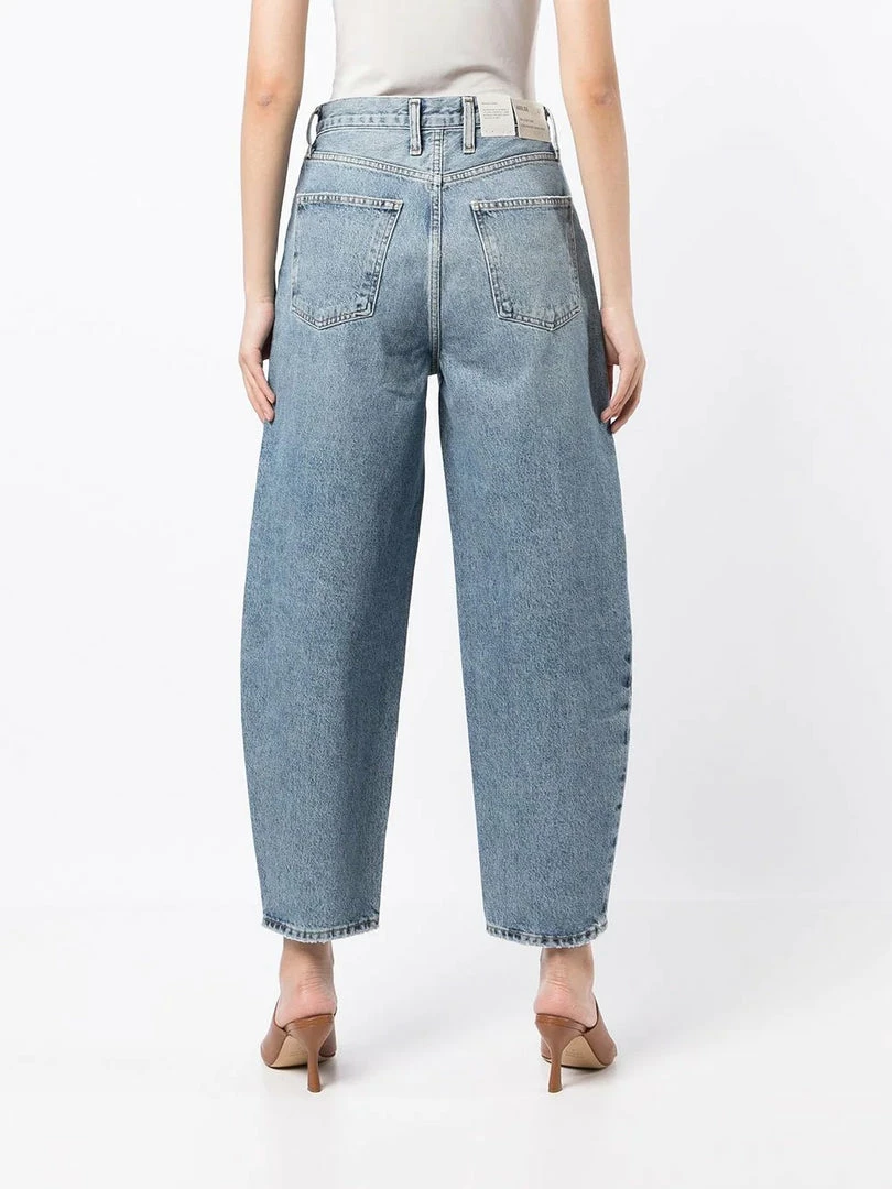 Agolde ‘Balloon High Rise Curved Taper Jeans’ featuring a front button and zip fastening, belt loops, a five pocket design, a balloon tapered leg, a high rise style and a medium blue denim wash. Item fits true to size. Model is wearing a size 26 W.Â