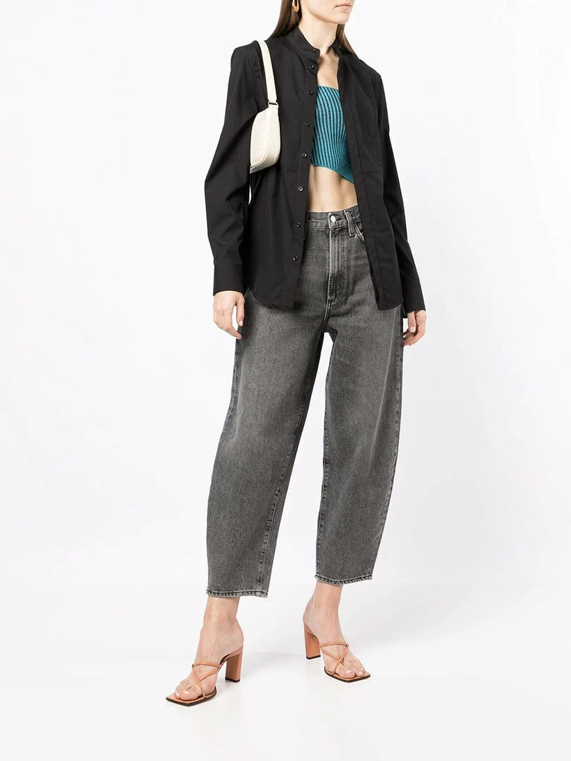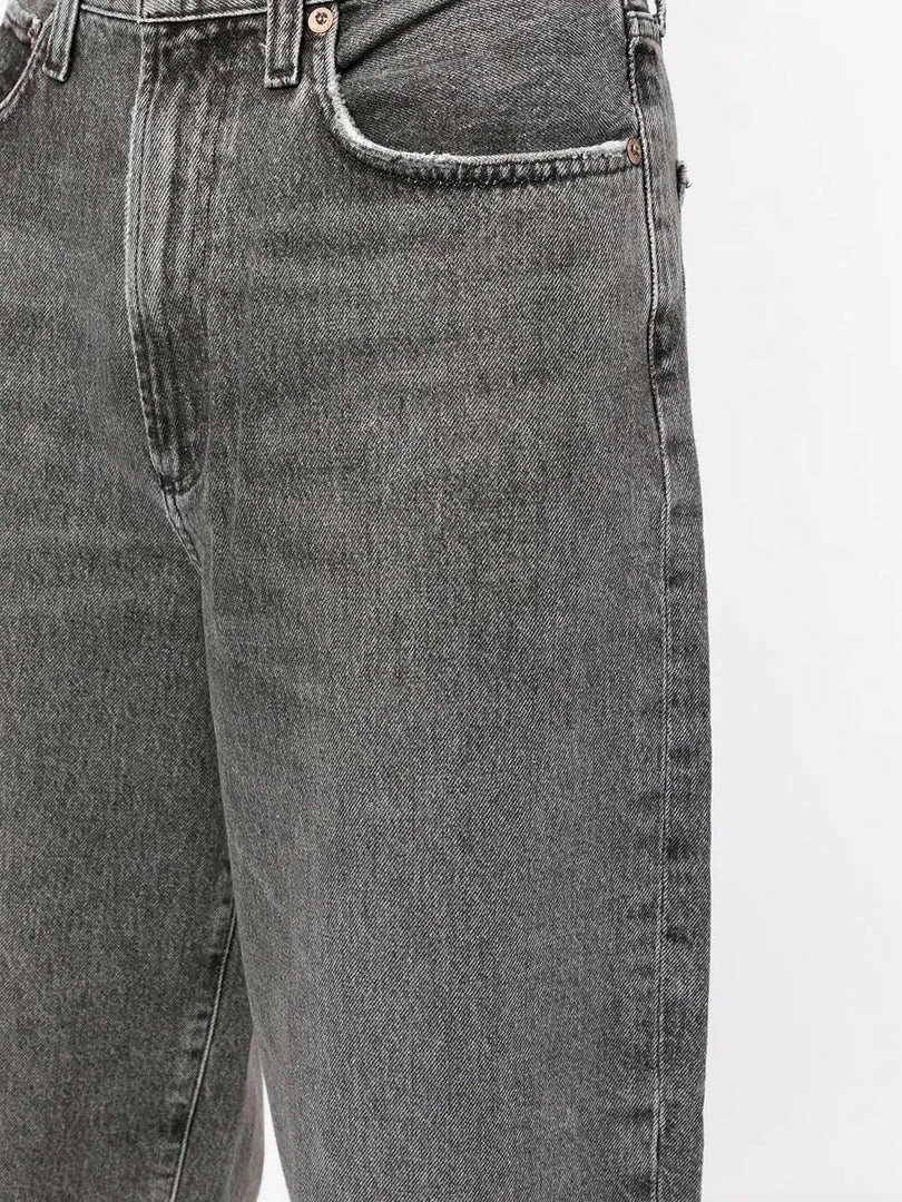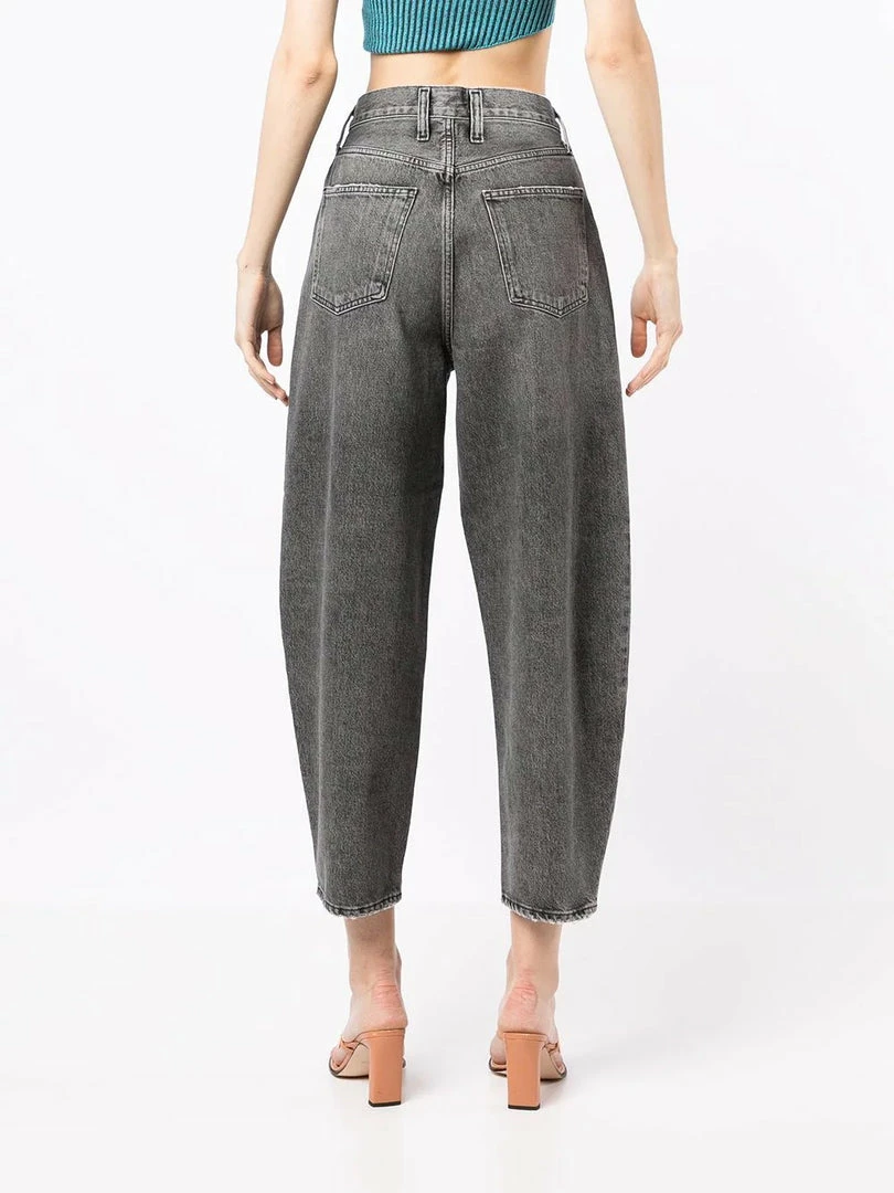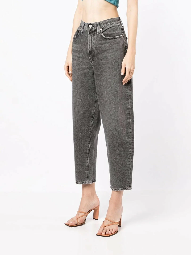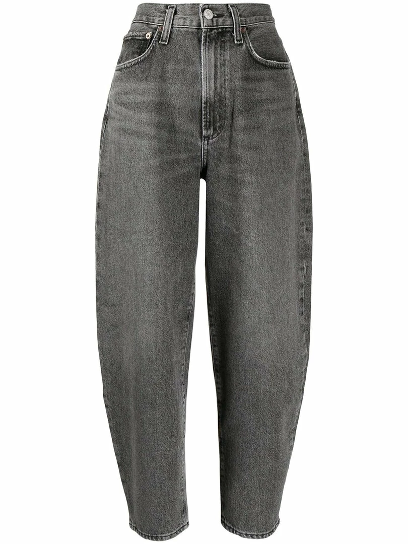 Agolde ‘Balloon High Rise Curved Taper Jeans’ featuring a front button and zip fastening, belt loops, a five pocket design, a balloon tapered leg, a high rise style and a grey denim wash. Item fits true to size. Model is wearing a size 27 W.Â