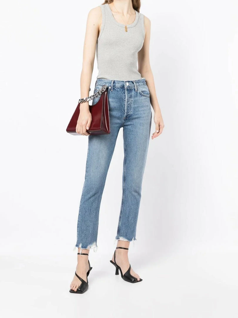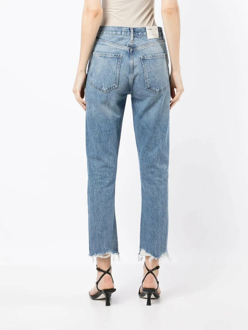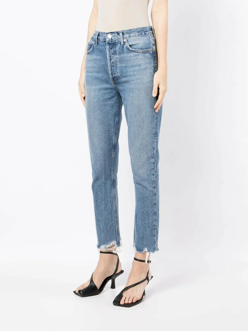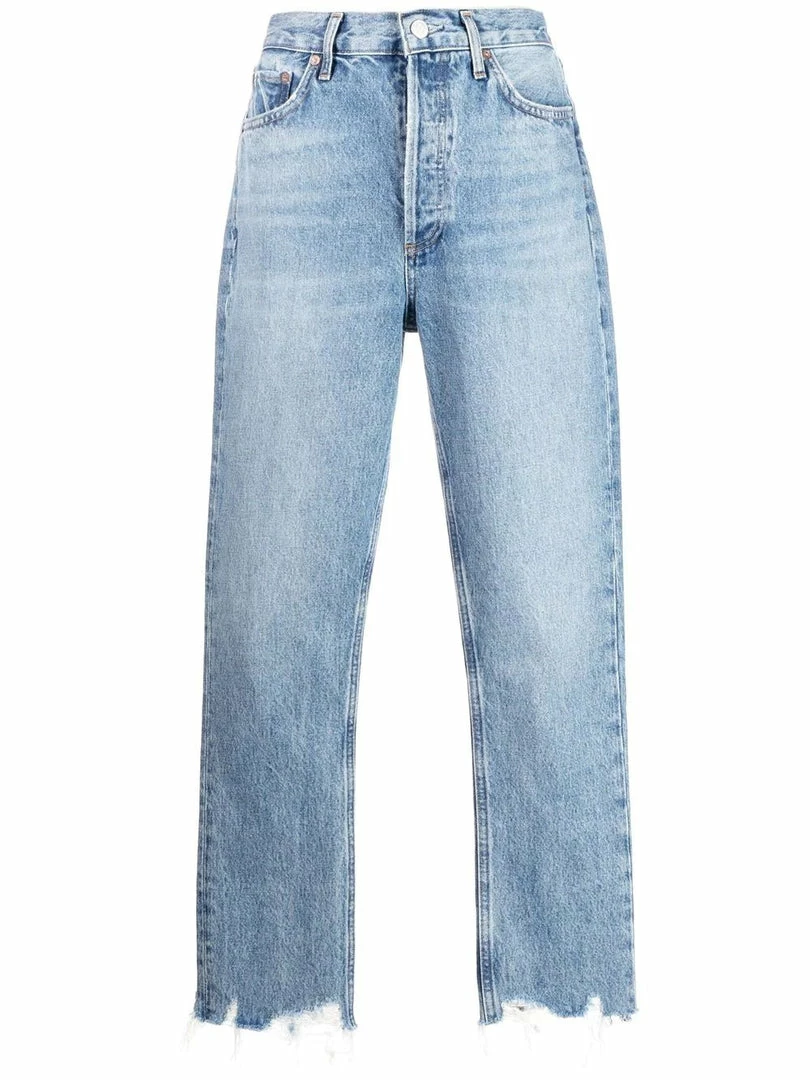 Agolde light blue ‘Riley Crop High Rise Jeans’ featuring belt loops, front button fastenings, a five pocket design, distressed details, a cropped straight leg fit and a high waist style. Item fits true to size. Model is wearing a size 27W.