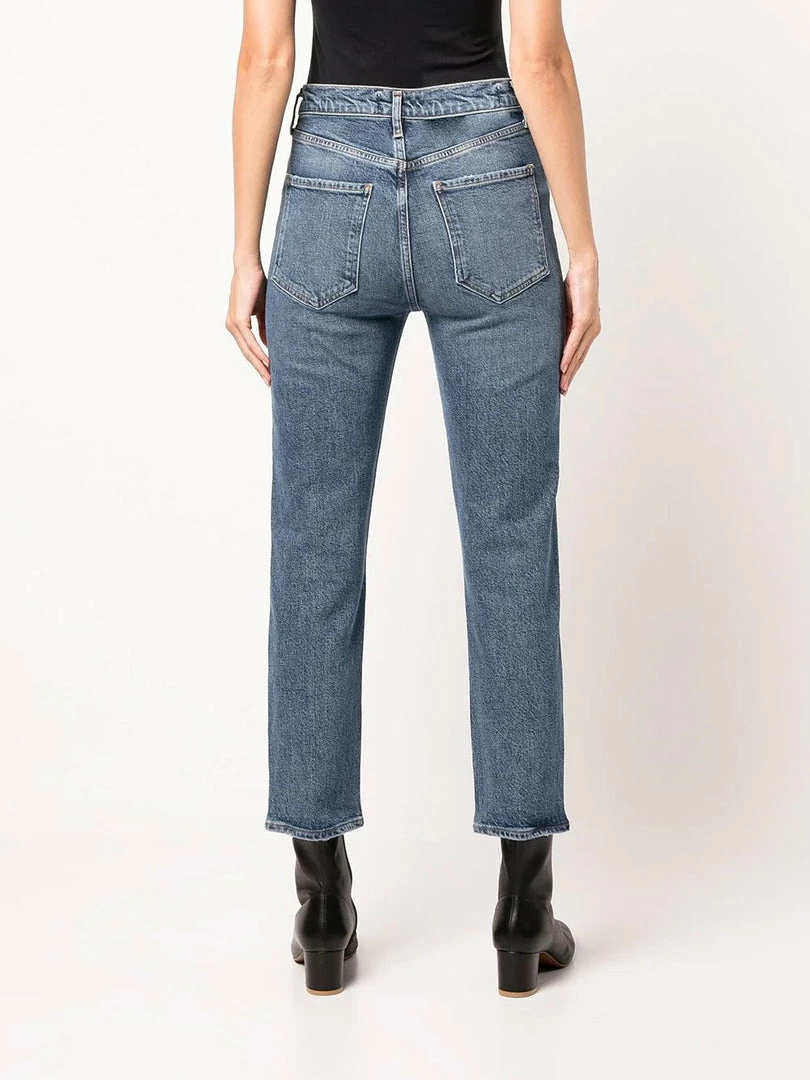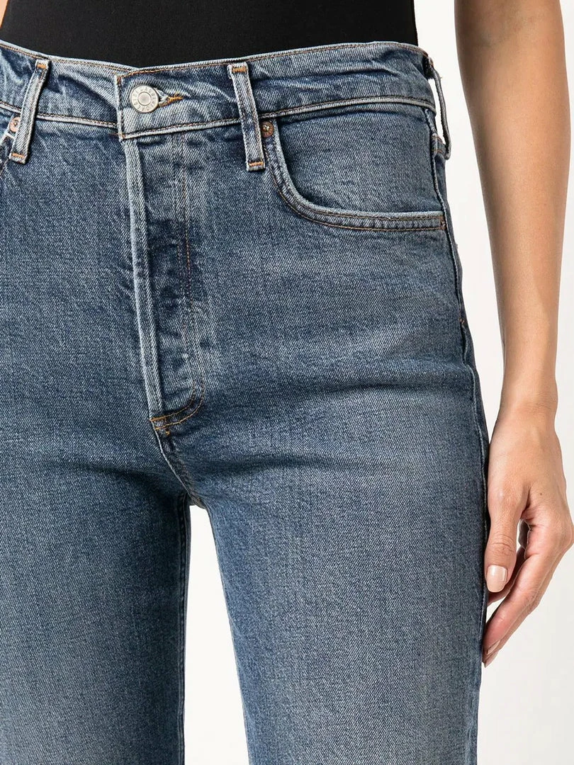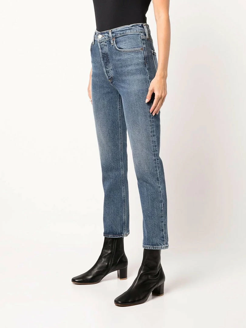 Agolde medium blue ‘Riley Crop High Rise Jeans’ featuring belt loops, front button fastenings, a five pocket design, a cropped straight leg fit and a high waist style. Item fits true to size. Model is wearing a size 27W.