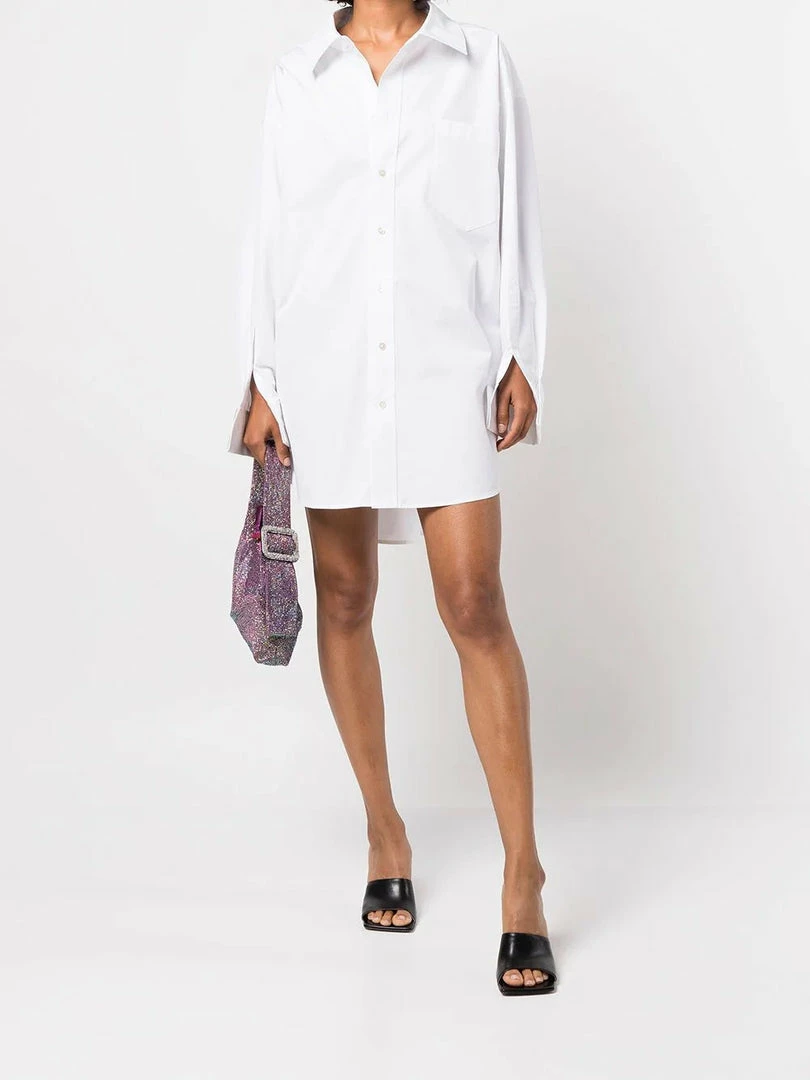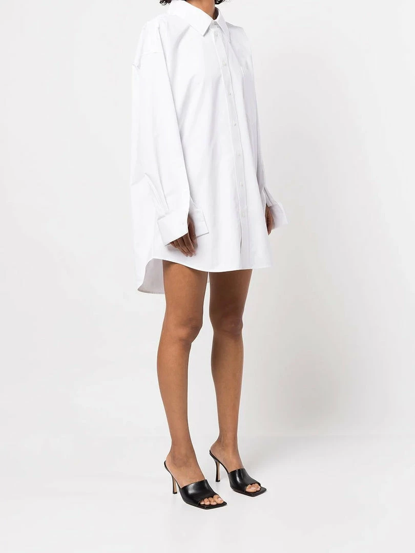 Alexander Wang white ‘Oversized Shirt Dress’ featuring a classic collar, front button fastenings, long sleeves with turned up buttoned cuffs and slit details, a front stitched logo design, a chest patch pocket, pleat details and a relaxed fit. Model is wearing a size XS.