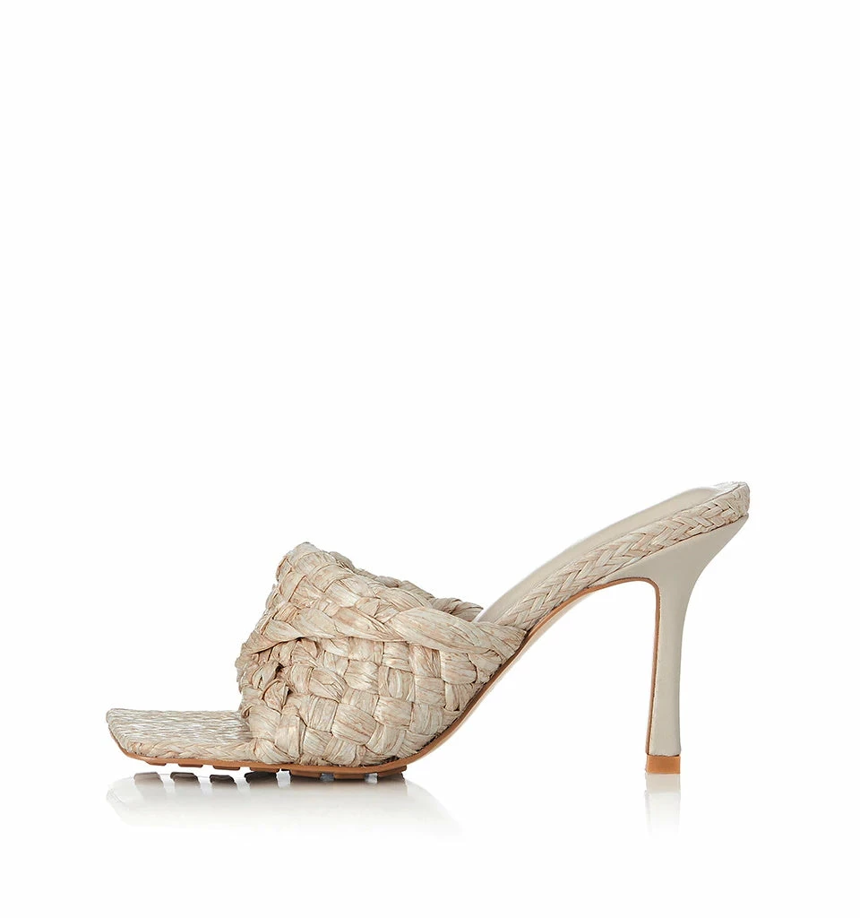 Alias Mae beige ‘Lennon’ mules featuring a square open toe, a woven design, a branded insole, a 10cm heel and a slip on style. Made in China. Item fits true to size. European Sizing.