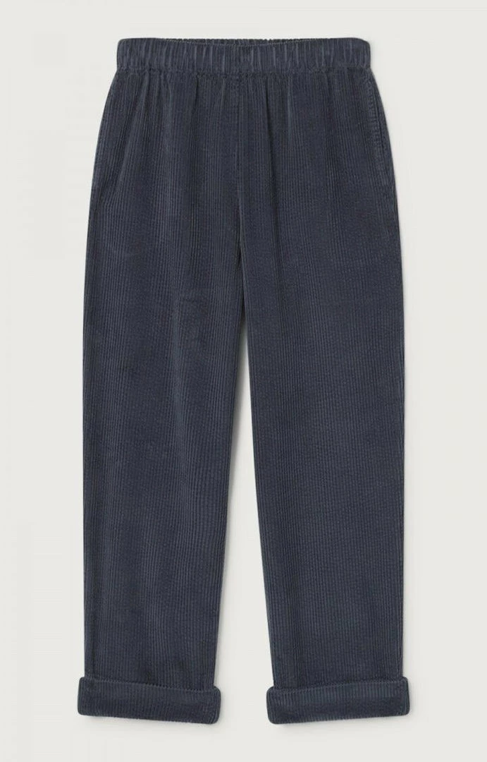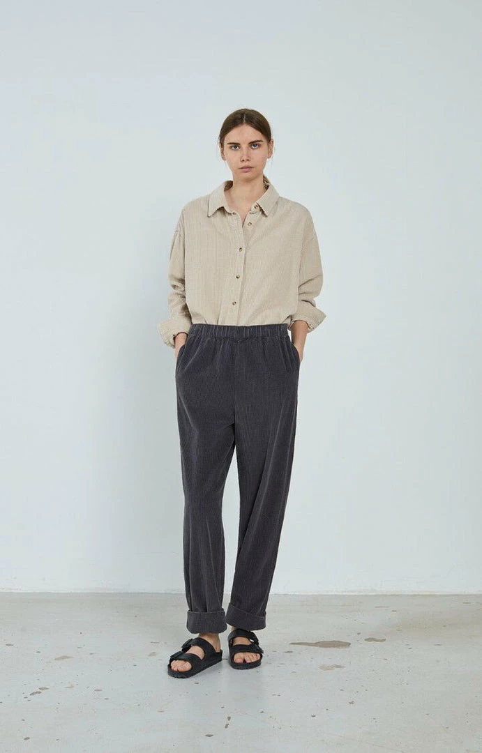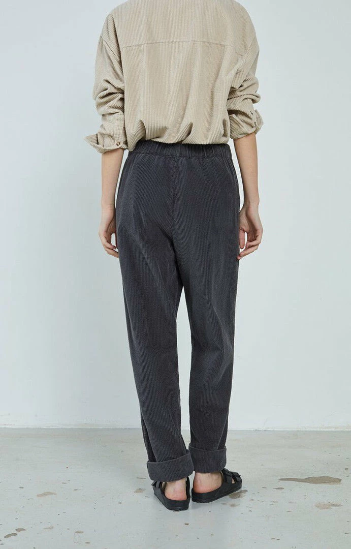 American Vintage faded grey ‘Padow’ corduroy trousers featuring a drawstring waist, side slip pockets, a baggy leg fit and turned up hems. Item fits true to size.