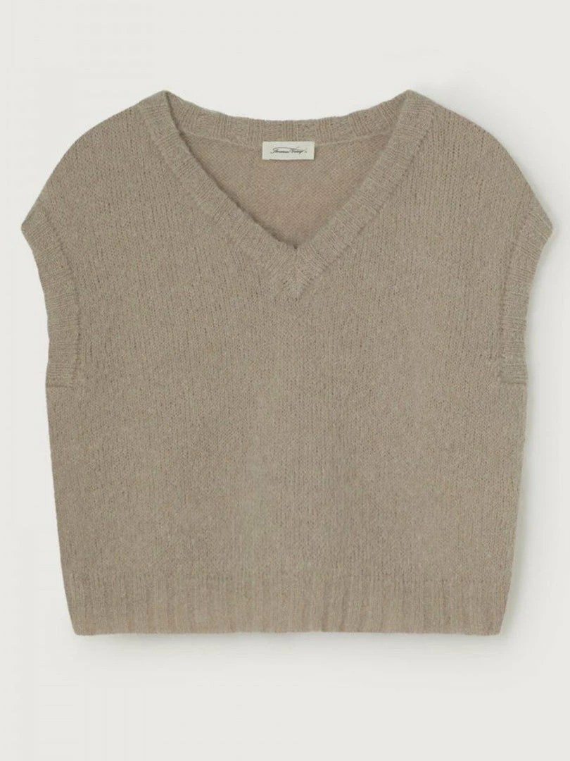 American Vintage ‘Pinobery’ knit vest featuring a V-neckline, a sleeveless design, ribbed hems and pulls on. Item fits true to size.
