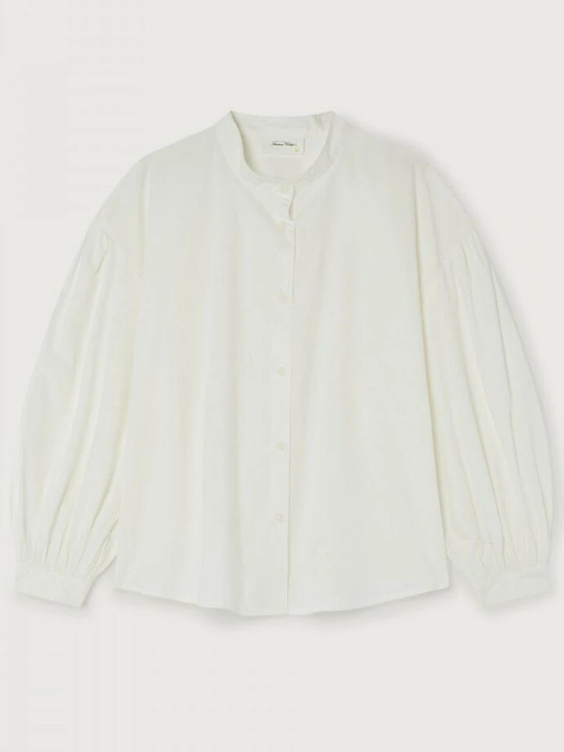 American Vintage white oversized ‘Hydway’ collarless shirt featuring a round neckline, front button fastenings, long puff sleeves with buttoned cuffs and a curved hemline.