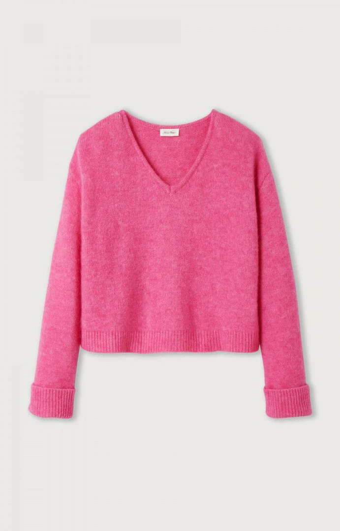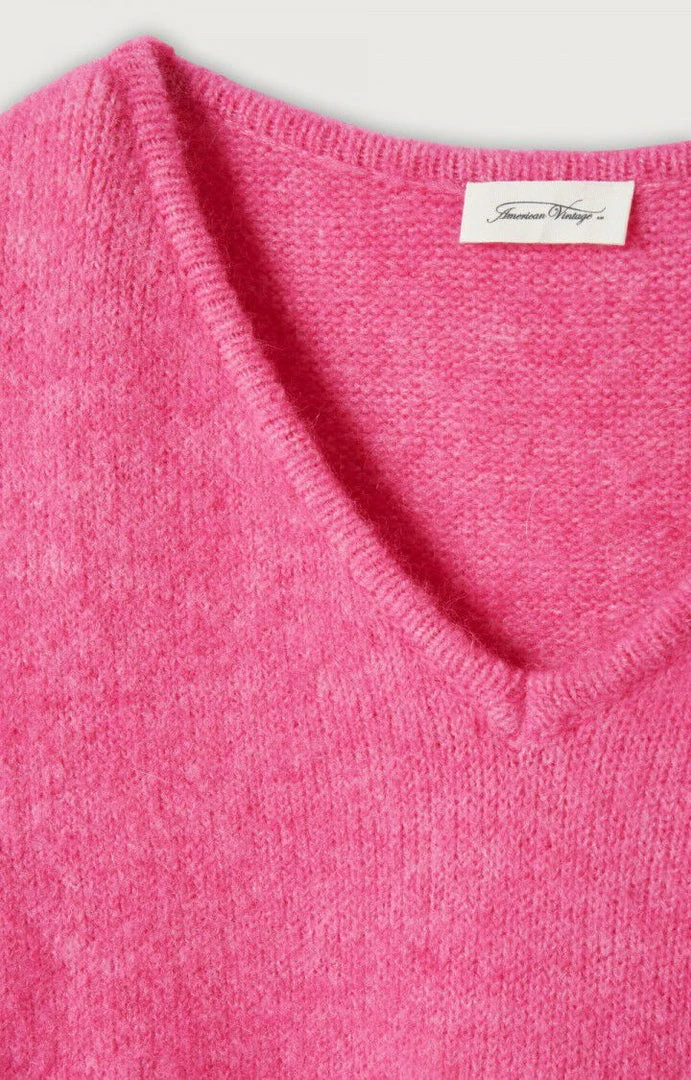 American Vintage pink ‘East 18H VN’ knit sweater featuring a v-neckline, long sleeves with turned up cuffs, ribbed hems and pulls on. Item fits true to size.Â