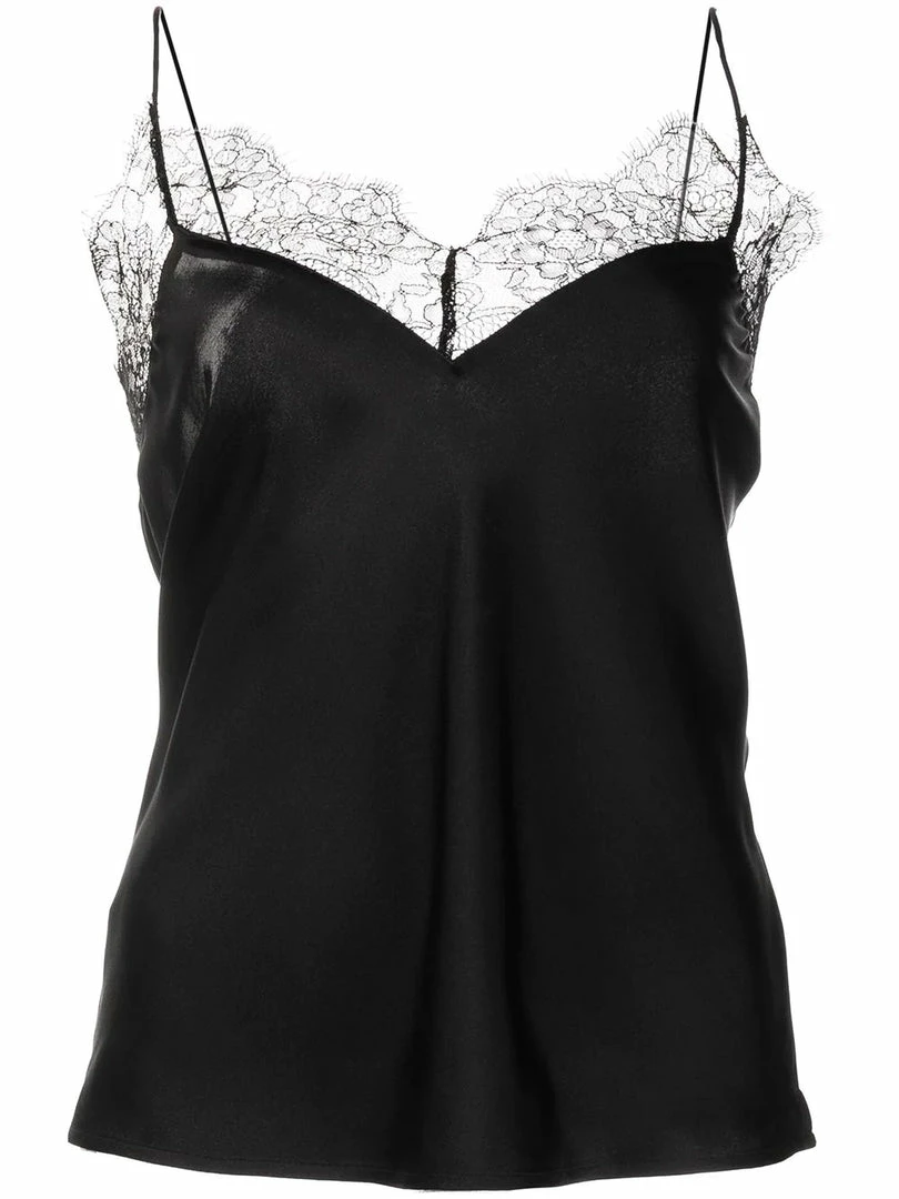 Anine Bing black ‘Remi’ camisole featuring a v-neckline, spaghetti straps, lace trimming, mini side slits and pulls on. Item fits true to size. Model is wearing a size XS. Â