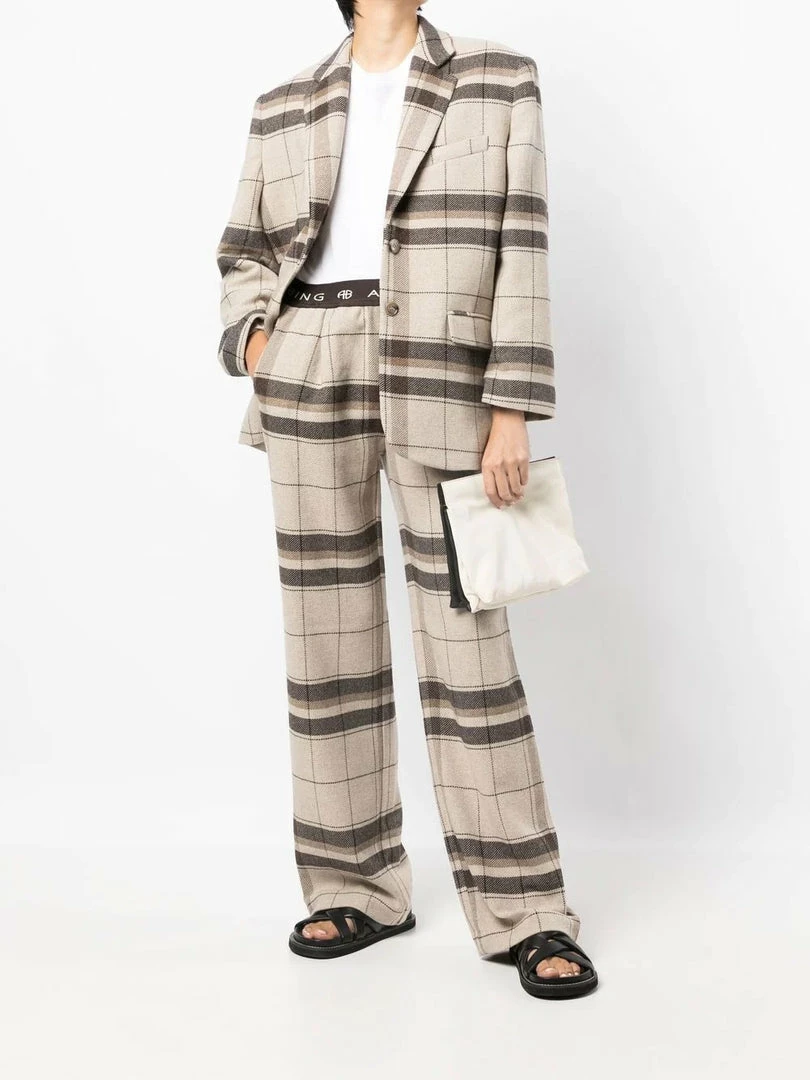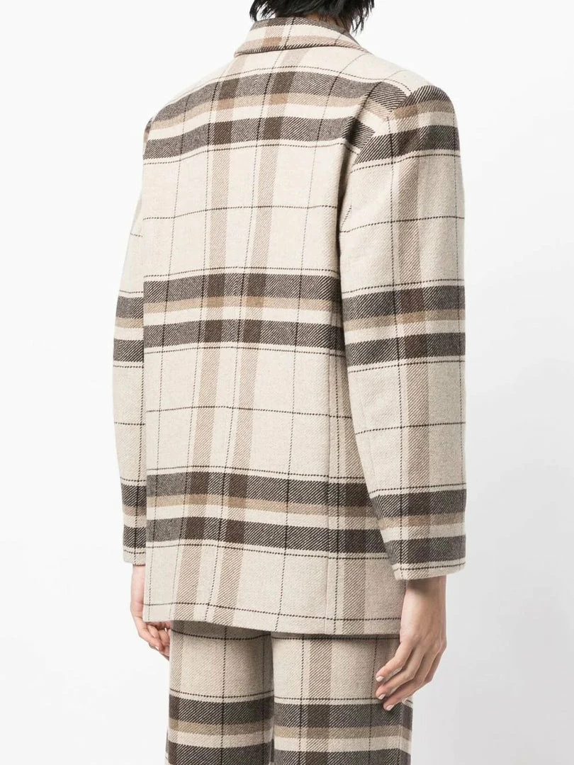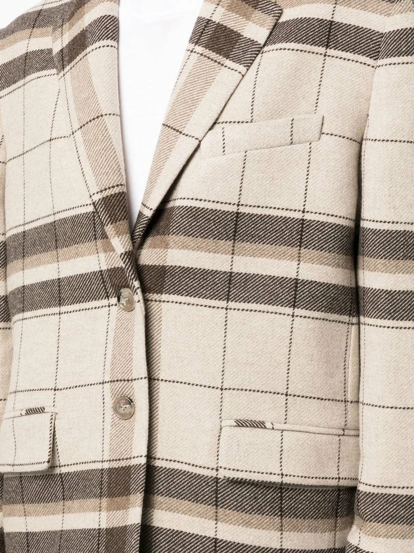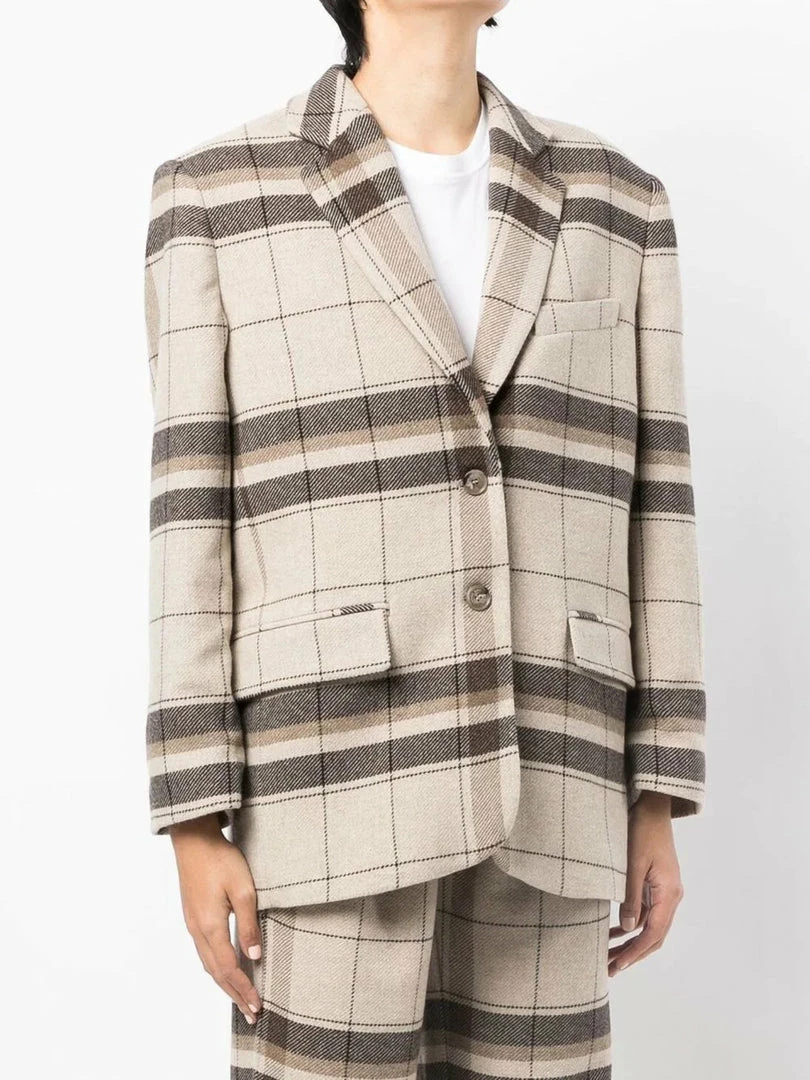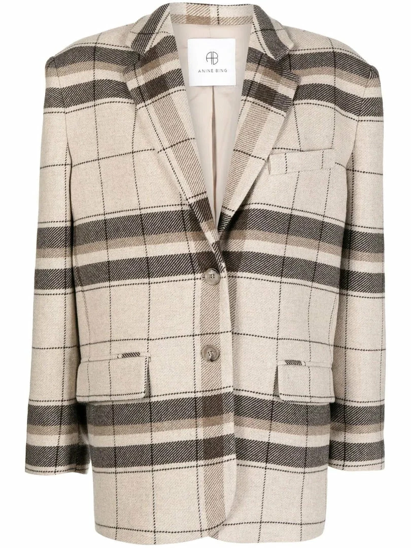 Anine Bing oversized ‘Quinn’ wool blazer featuring lapels, front button fastenings, padded shoulders, long sleeves, a three-pocket design and a curved hemline. Model is wearing a size XS.