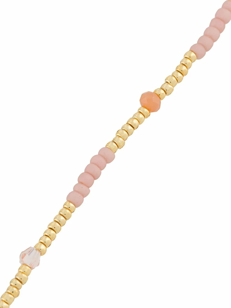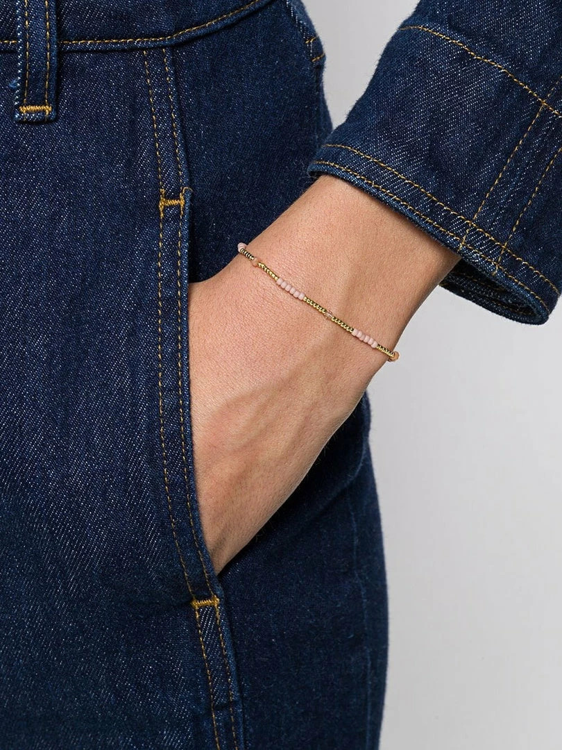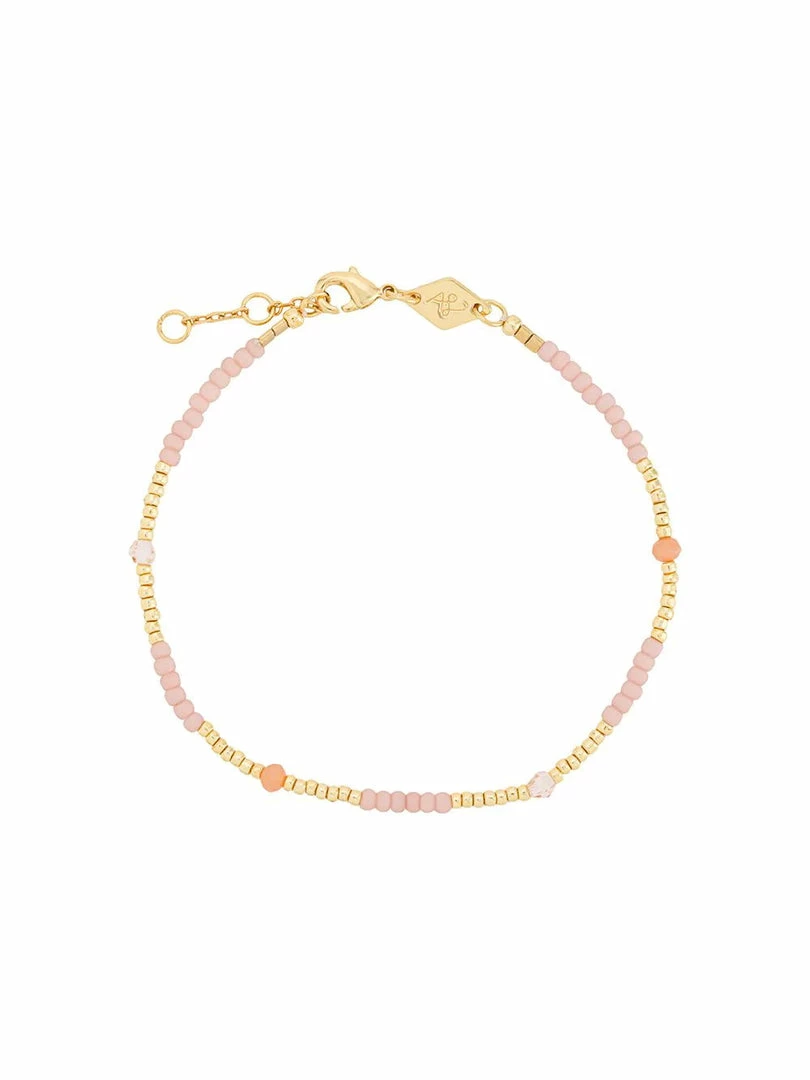 Anni Lu ‘Clemence’ beaded bracelet featuring a gold and light pink coloured bead design and an adjustable clasp closure. Length is 15.5-18cm. Made in Denmark.