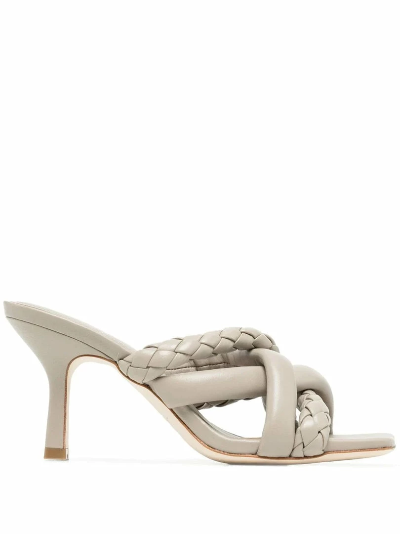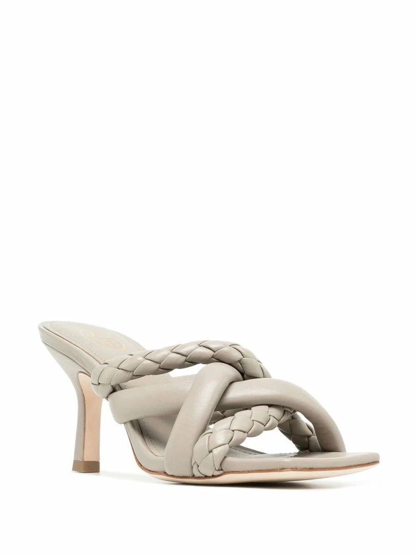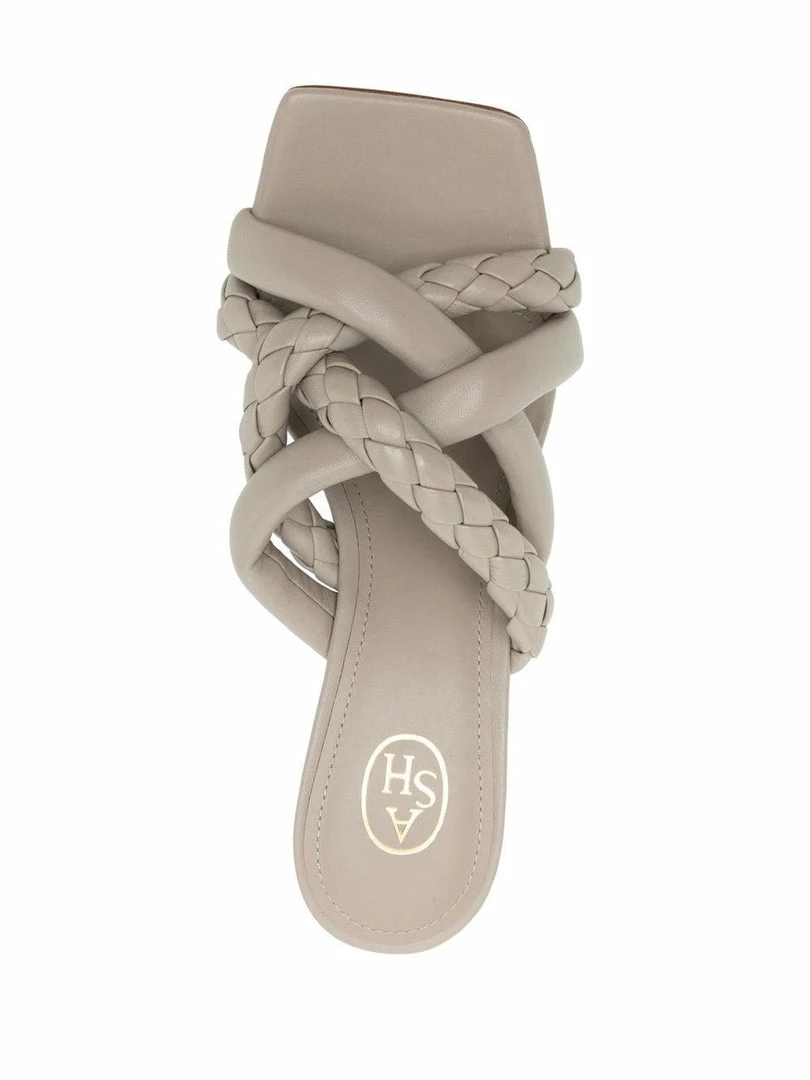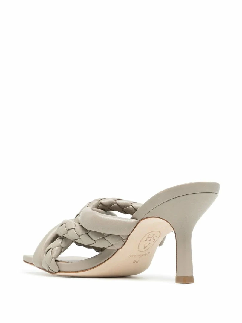 ASH light grey ‘Minabis’ heeled mules featuring an open toe, a interwoven braided design, a branded insole and a slip on style. Item fits true to size. Italian Sizing.