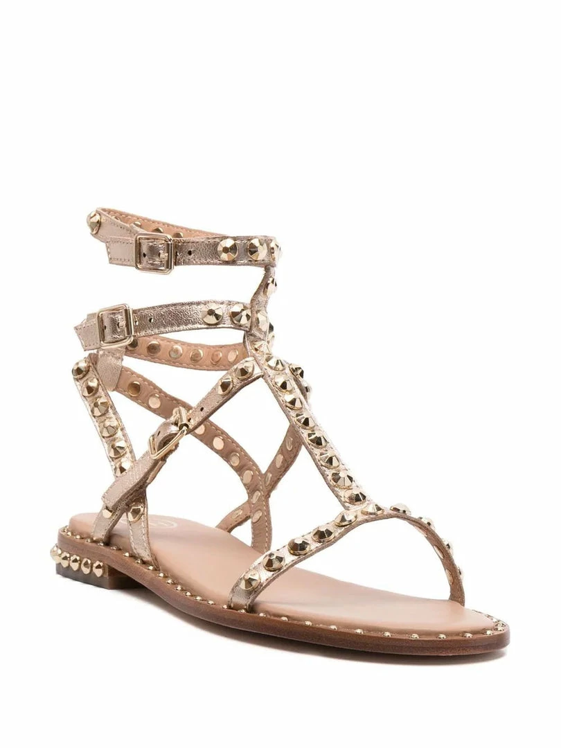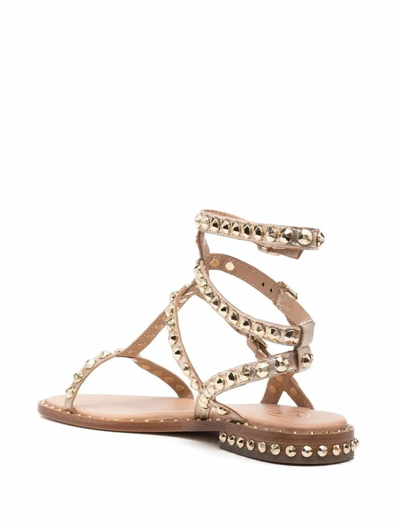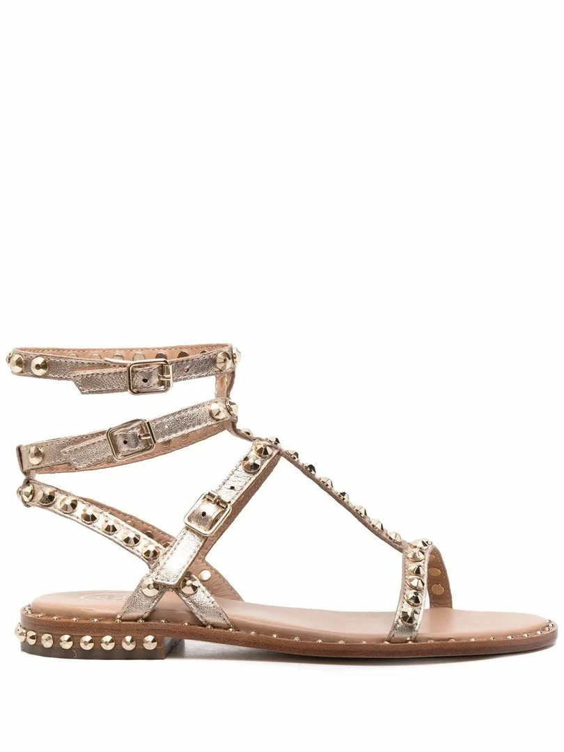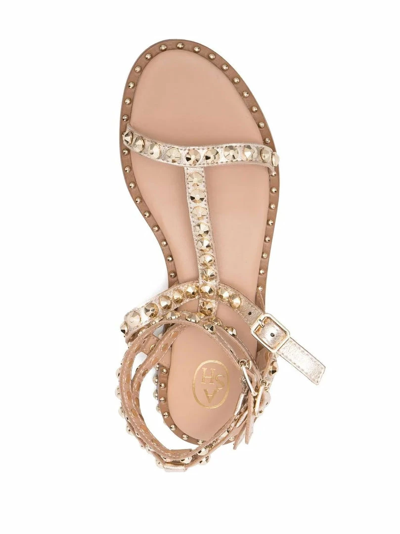 ASH ‘Play’ gold sandals featuring an open toe, a studded design, a branded insole and a three buckle ankle fastening. Item fits true to size. Italian Sizing.