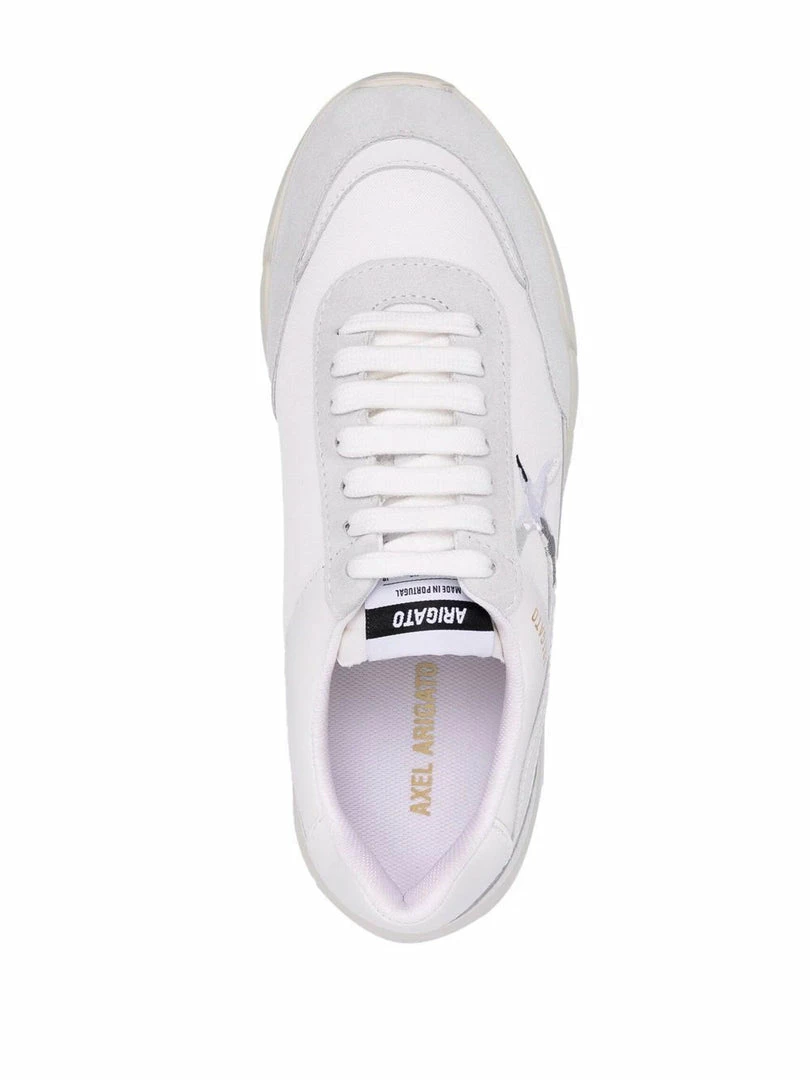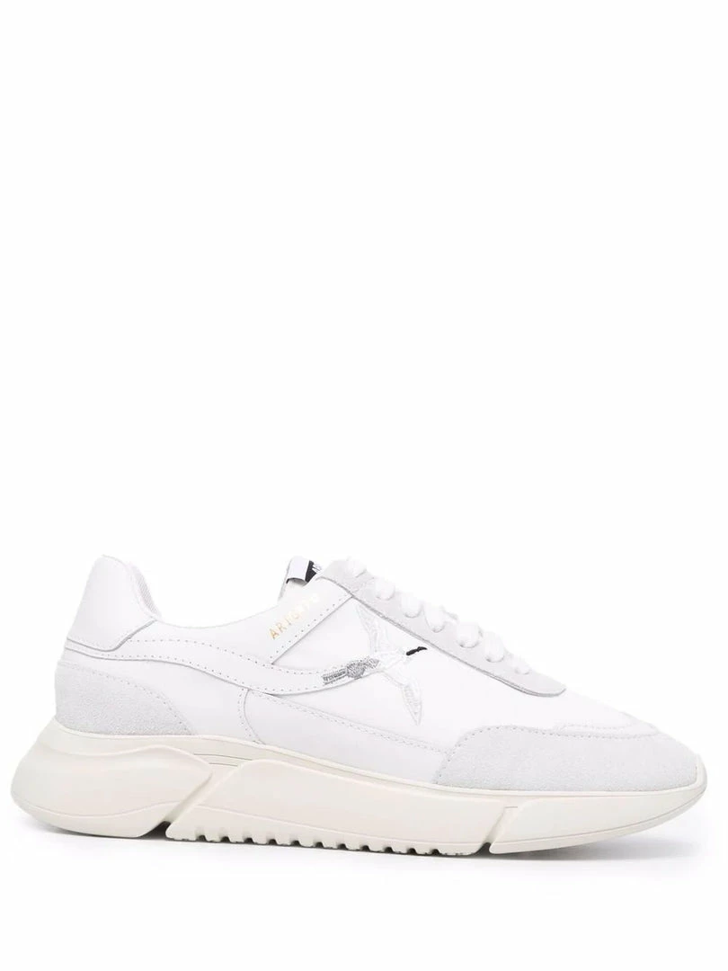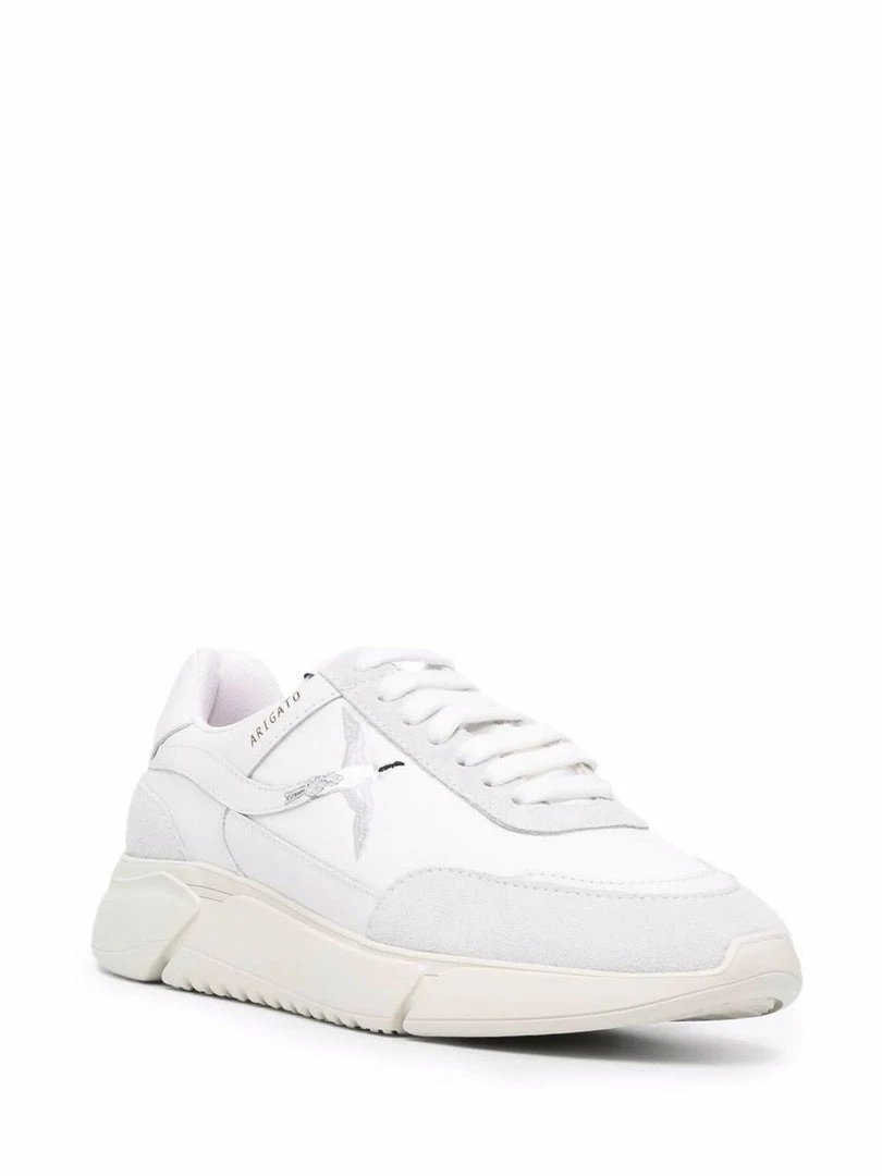 Axel Arigato white ‘Genesis Stripe Bird Bee Trainers’ featuring a round toe, a front lace-up fastening, grey suede details, a grey and white embroidered signature bird design and gold embossed brand logo on the side, a low top style and a platform sole. Item fits true to size. Made in Portugal. Italian Sizing.