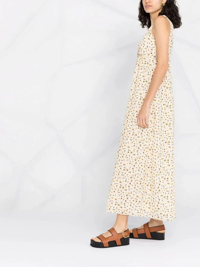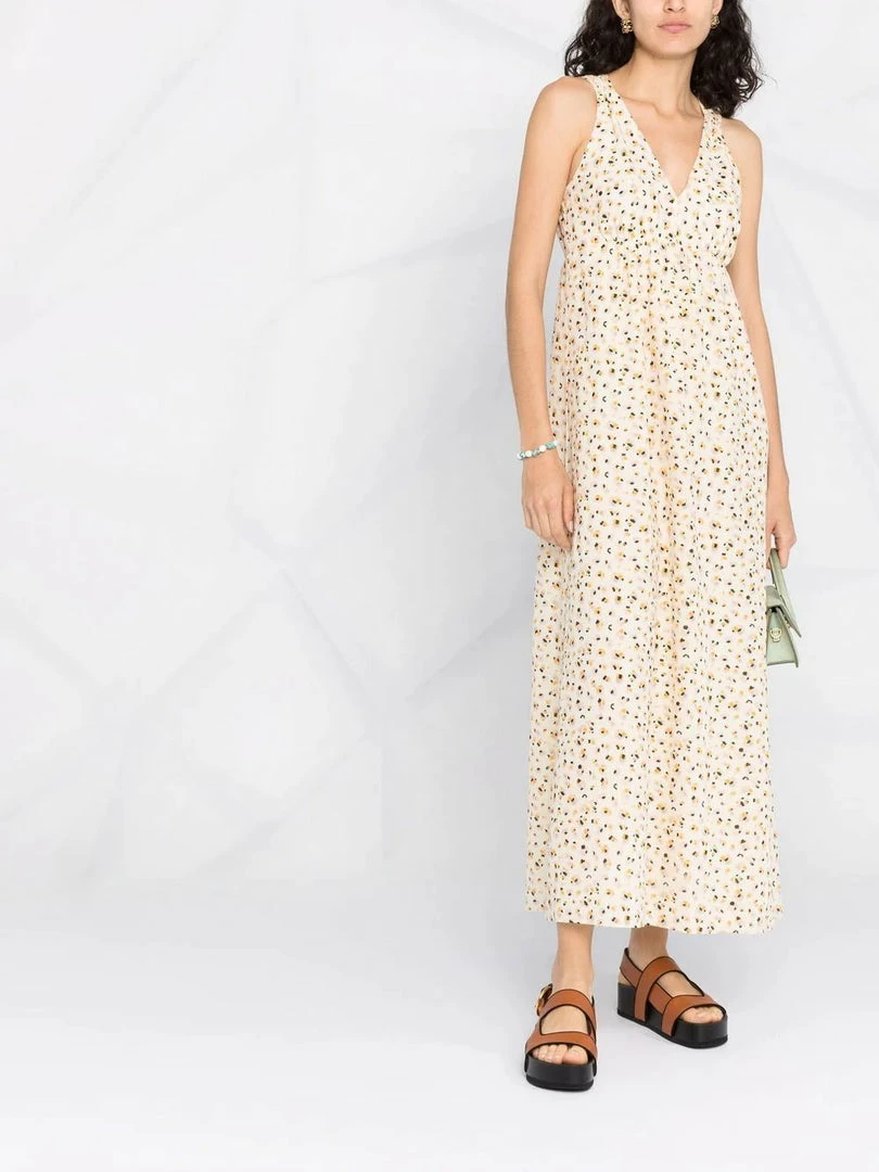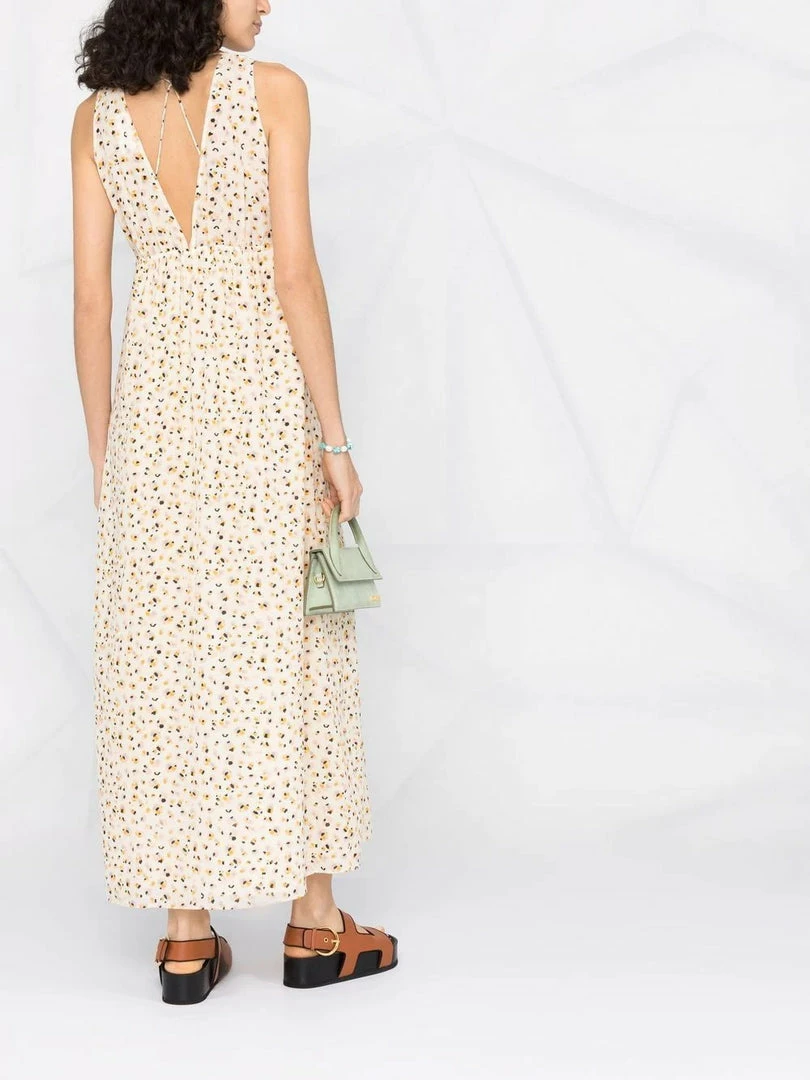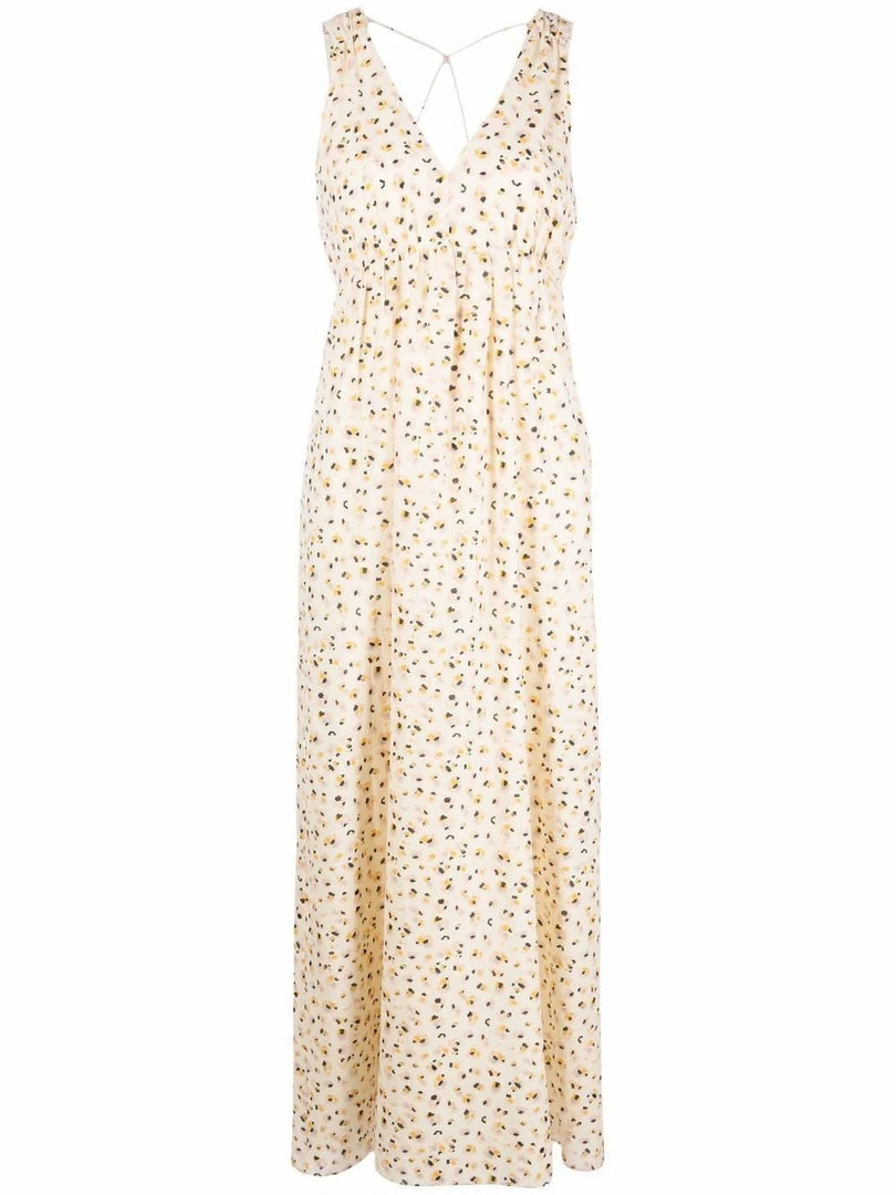 Ba&sh cream ‘Becky’ maxi dress featuring a deep V-neckline, thick straps with a back tie fastening detail, an elasticated empire waistline, a multicoloured abstract animal spot print, a long length and pulls on. Item fits true to size. Model is wearing a size 0.Â