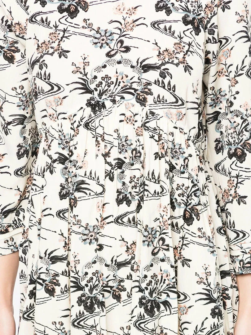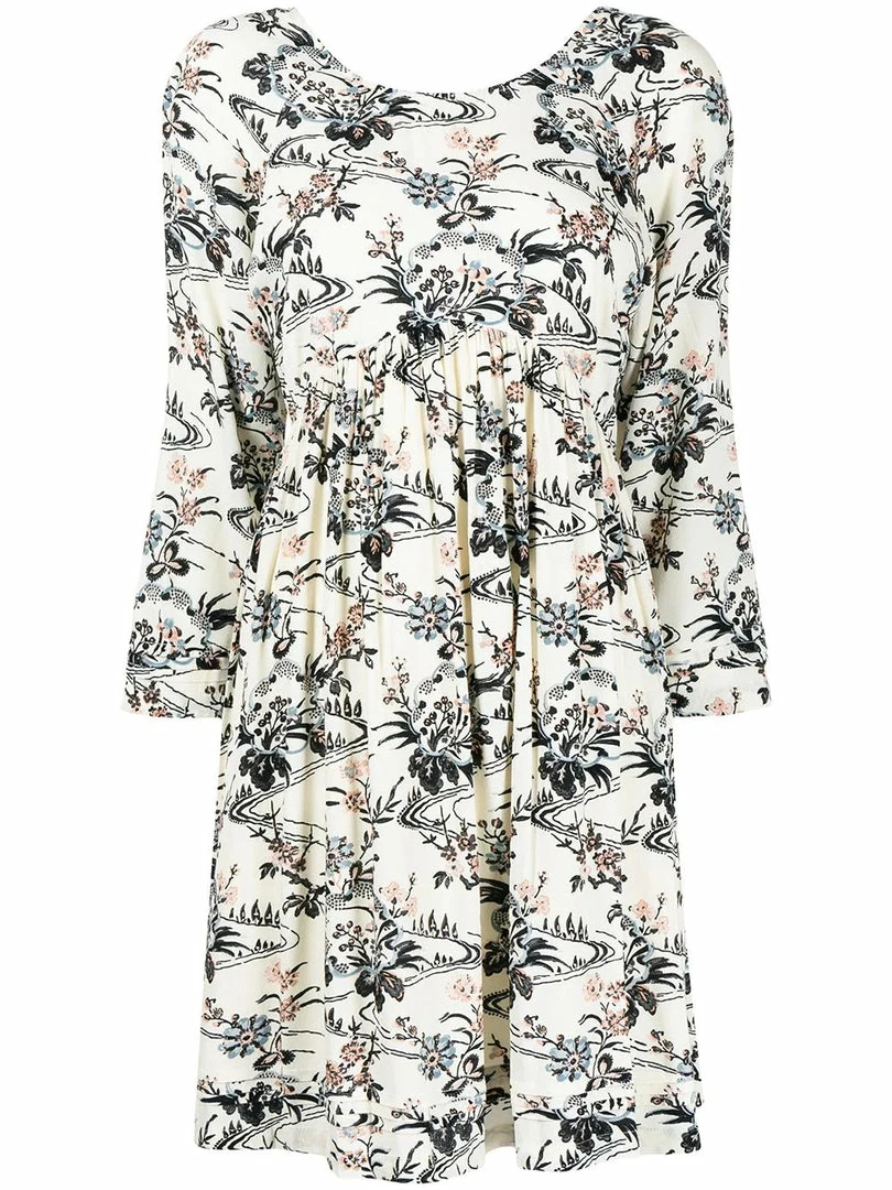 Ba&sh off white ‘Fina’ floral mini dress featuring a round neckline, a low backline, a back zip fastening, cropped long sleeves, an empire waistline, a multicoloured landscape and floral print and a short length. Item fits true to size. Model is wearing a size 1.
