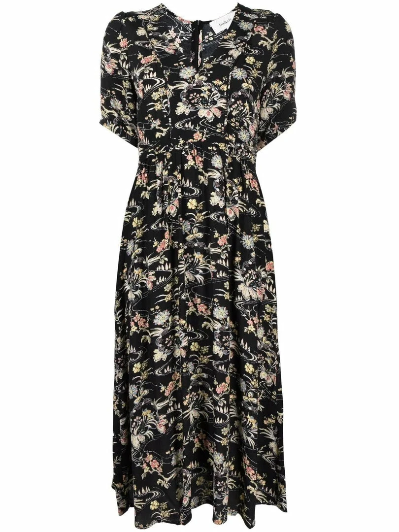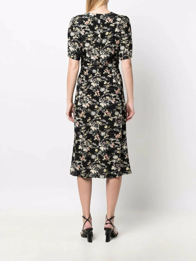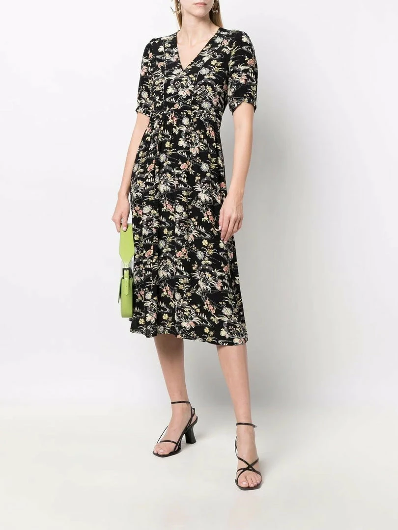 Ba&sh black ‘Floe’ floral midi dress featuring a V-neckline, short sleeves, a back zip fastening, a landscape and floral print and a midi length. Item fits true to size. Model is wearing a size 1.Â