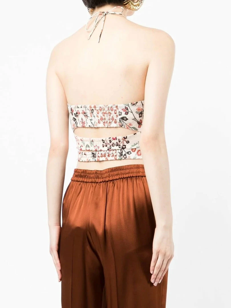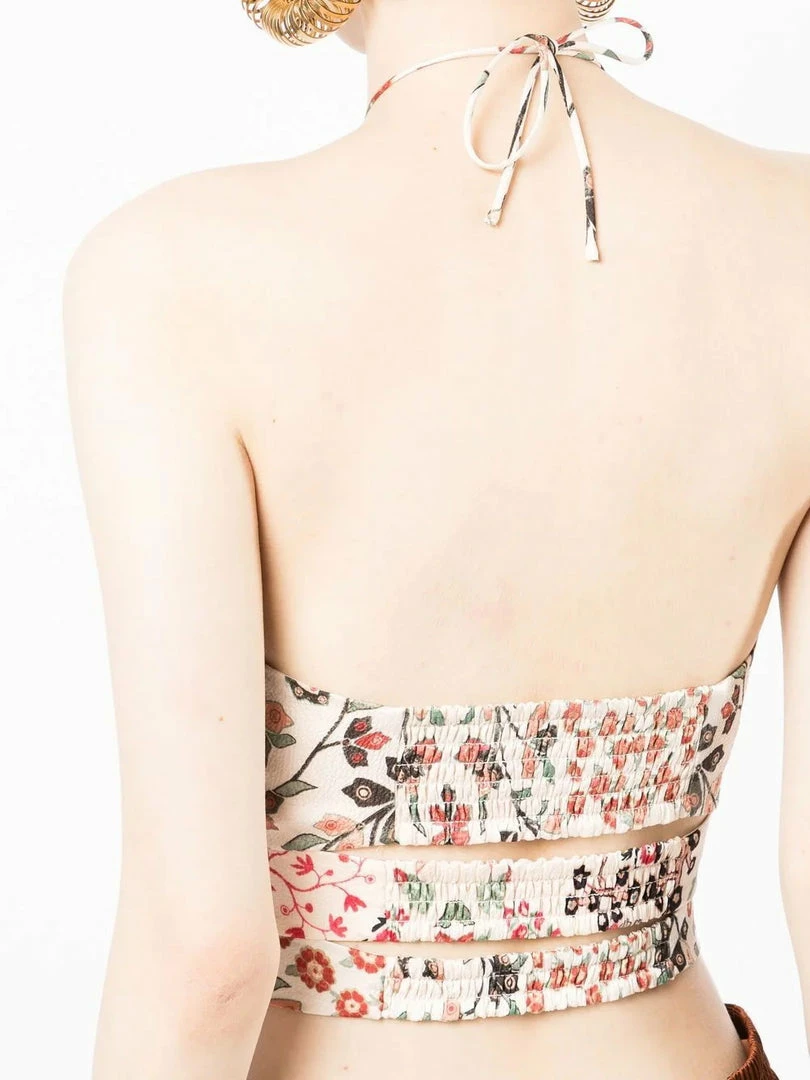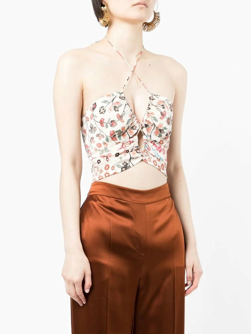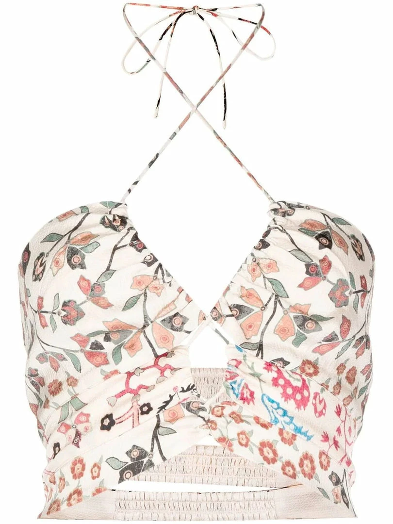 Ba&sh ecru ‘Giulia’ top featuring a front tie detail with a keyhole design, a multicoloured floral print, cut out details with gathered back straps and a sleeveless style. Item fits true to size. Model is wearing a size 0.