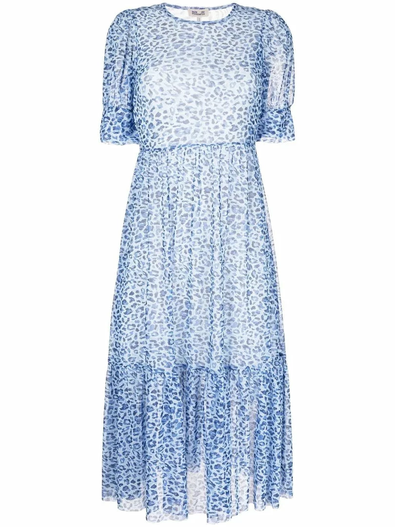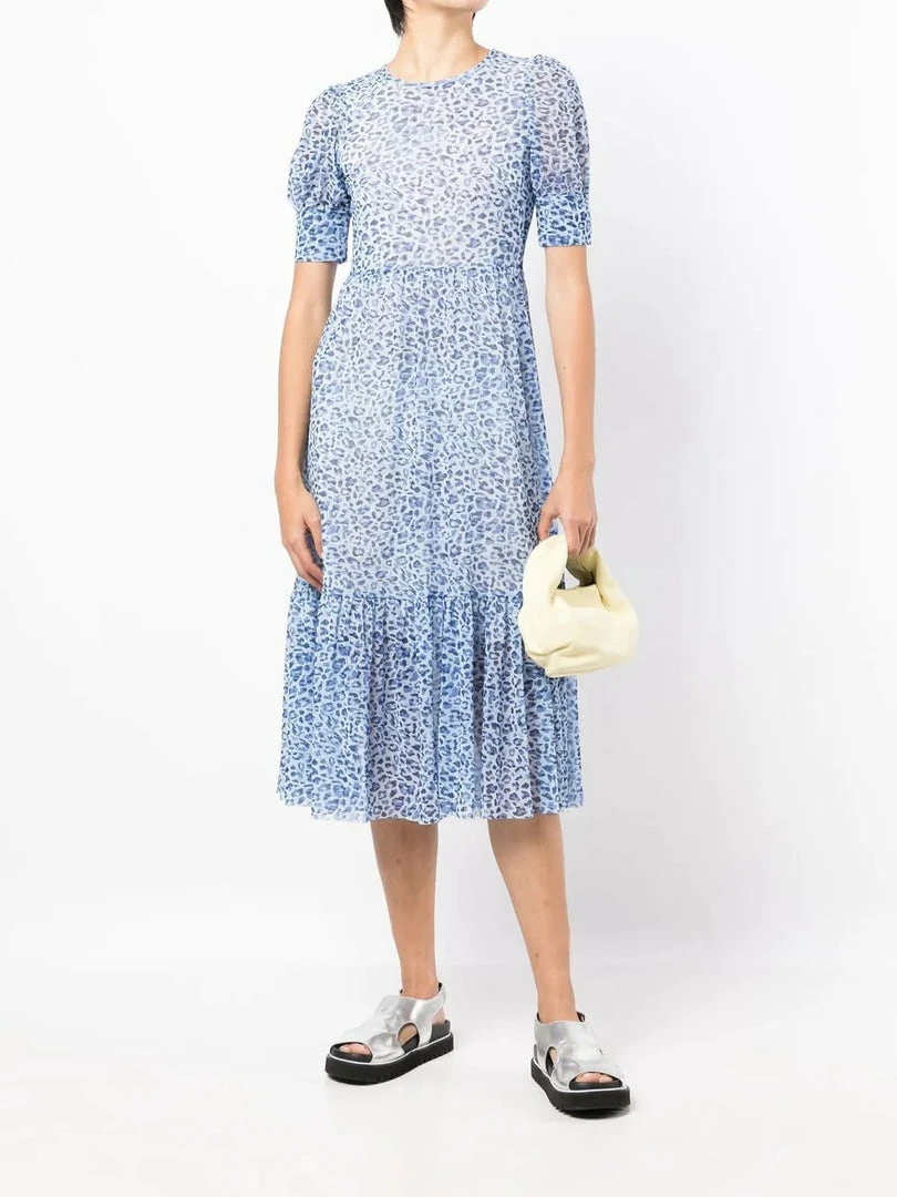 Baum und Pferdgarten blue ‘Jocelyn’ leopard mesh midi dress featuring a round neckline, short sleeves, a tiered skirt and pulls on. Item fits true to size. Model is wearing a size XS.