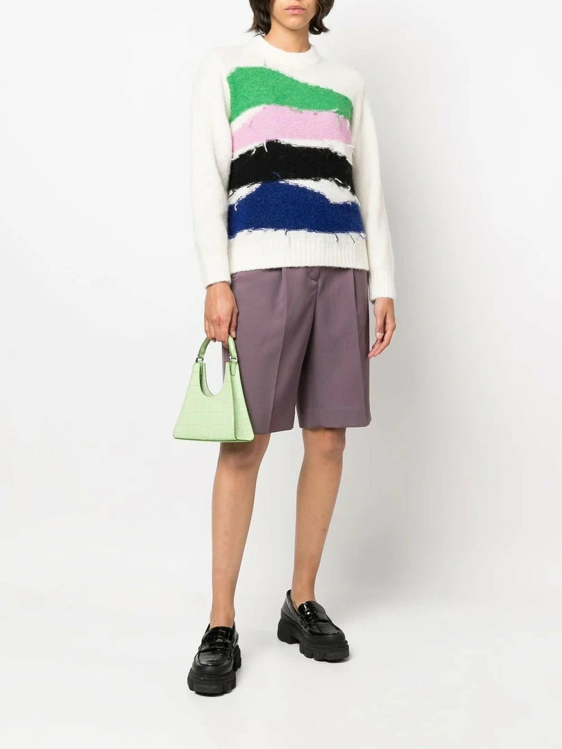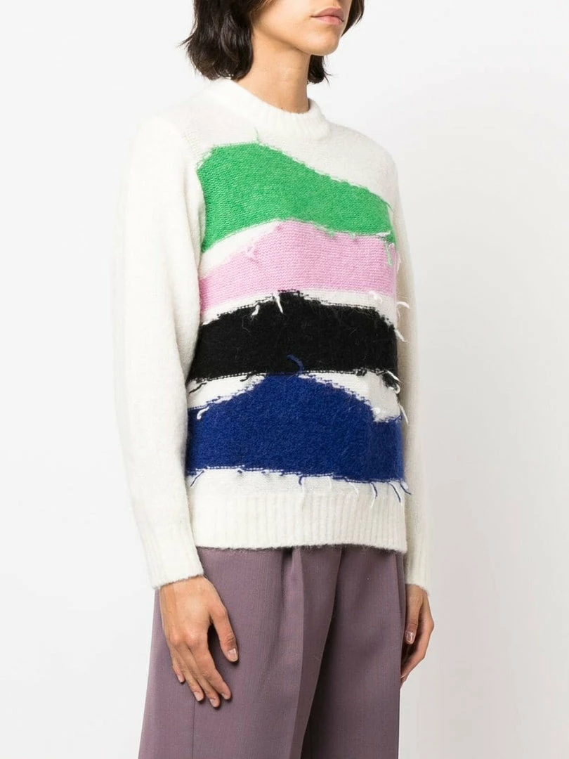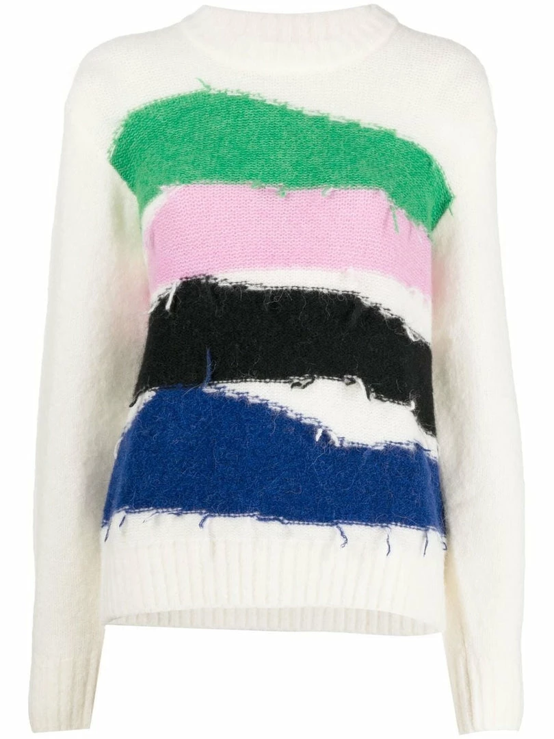 Baum Und Pferdgarten off white ‘Cecilee’ knit sweater featuring a round neck, long sleeves, ribbed hems, a multicoloured horizontal striped design with frayed detailing on the bodice and a pull on style. Item fits true to size. Model is wearing a size XS.Â