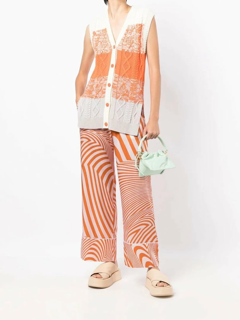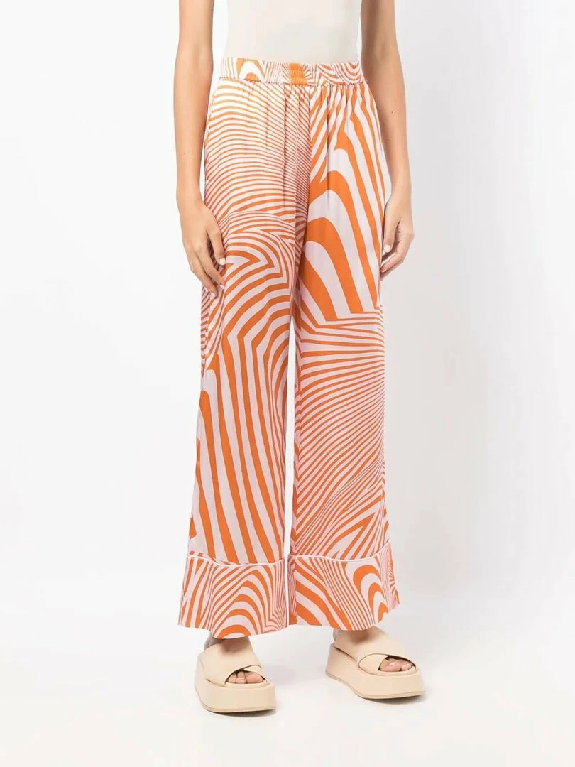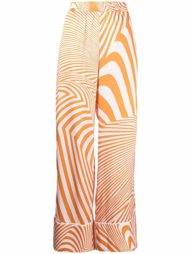 Baum Und Pferdgarten orange ‘Naeva’ psychedelic print trousers featuring an elasticated waistband, side slip pockets, a wide leg fit and pulls on. Ā Item fits true to size. Model is wearing a size 36 DE/DK.Ā