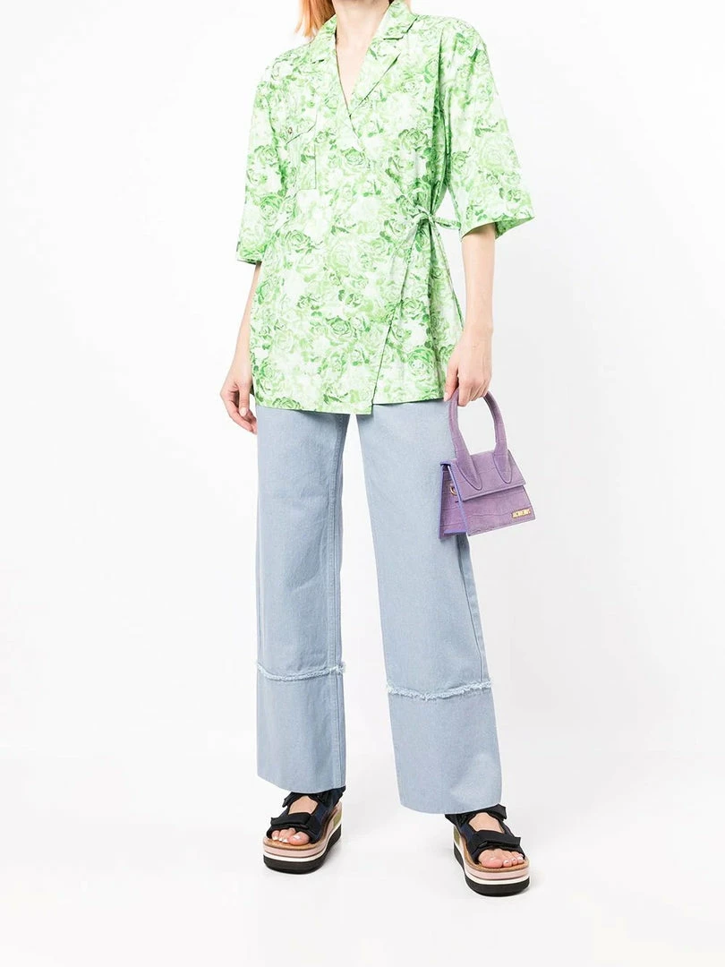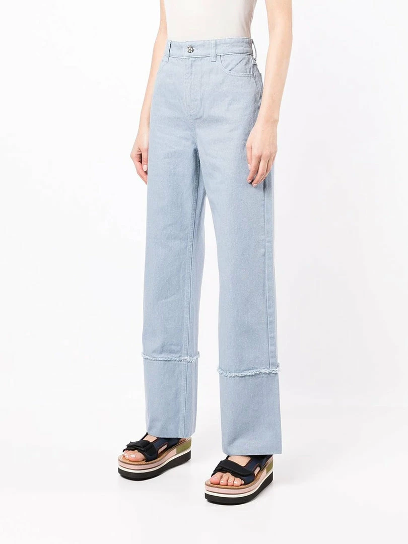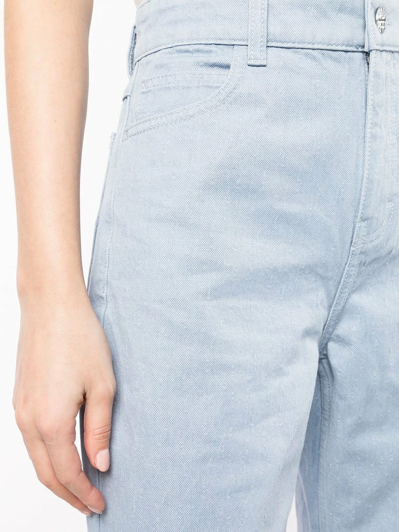 Baum und Pferdgarten ‘Nariko’ textured wide leg jeans featuring a front zip and button fastening, belt loops, a five pocket design, frayed cuff details, a wide leg fit, a high rise style and a light blue textured denim wash. Item fits true to size. Model is wearing a size 36 FR.