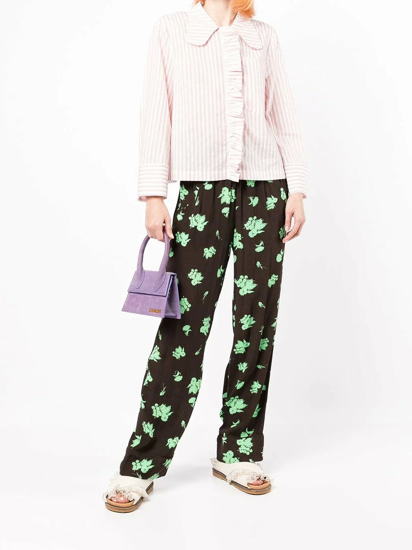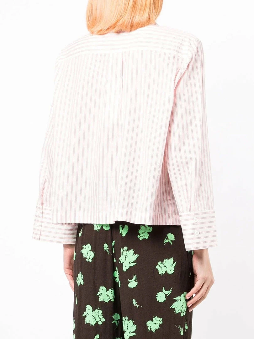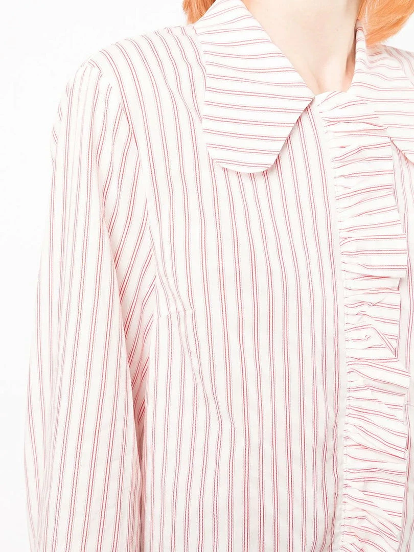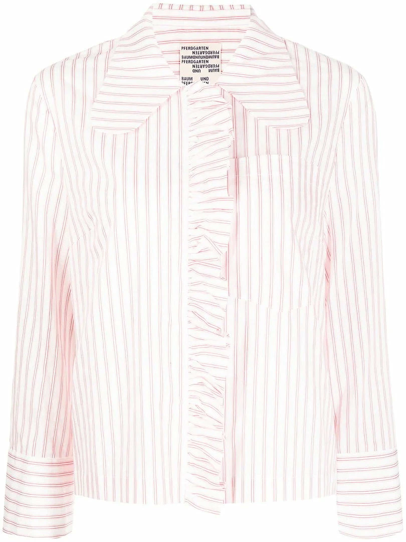 Baum und Pferdgarten ‘Matleena’ ruffle shirt featuring a curved collar, front button fastenings, long sleeves with buttoned cuffs, front chest patch pocket, a white and red striped print and a ruffled front detail. Item fits true to size. Model is wearing a size 36 FR.Â