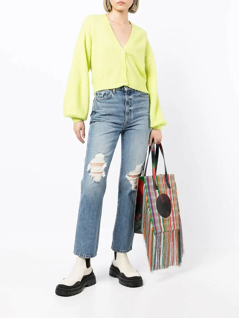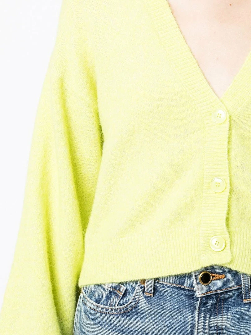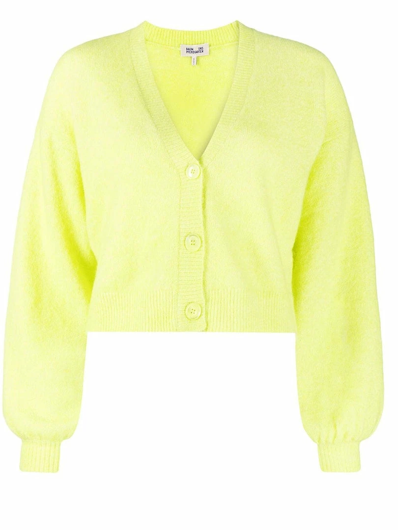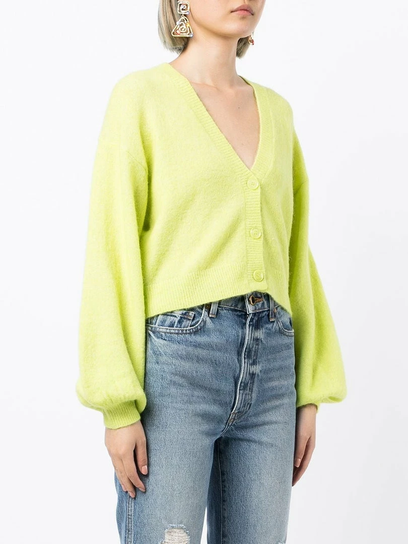 Baum und Pferdgarten lime ‘Chasmeen’ puff sleeve cardigan featuring a V-neckline, front button fastenings, long puff sleeves, ribbed hem details and a straight hemline. Item fits true to size. Model is wearing a size XS.Â