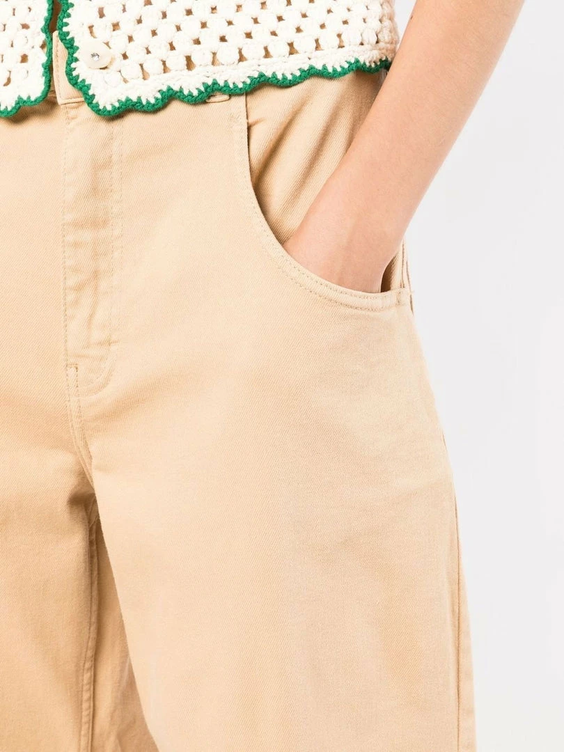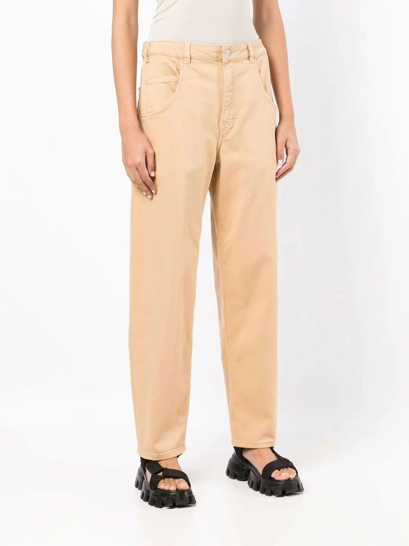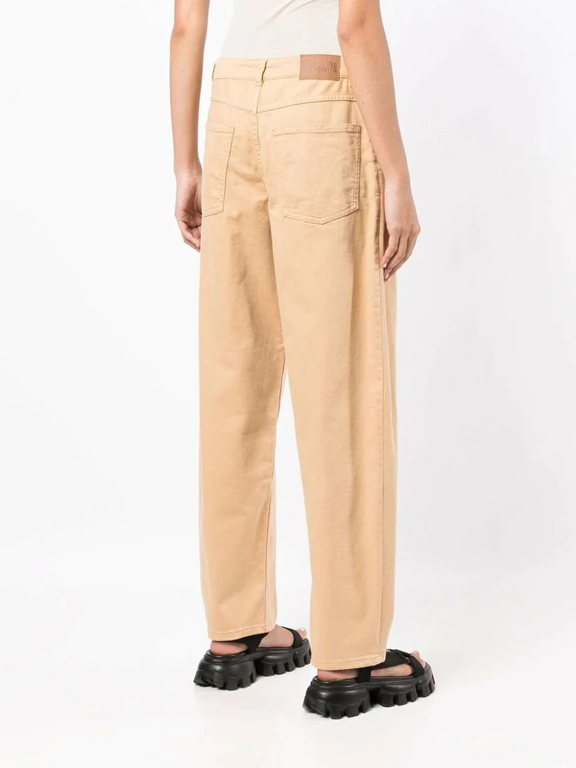 Baum Und Pferdgarten camel toned  ‘Nita’ jeans featuring a front button and zip fastening, belt loops, a five pocket design, a loose leg fit and a brown logo patch on the back. Item fits true to size. Model is wearing a size 36 DE/DK.Â