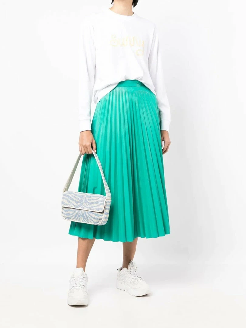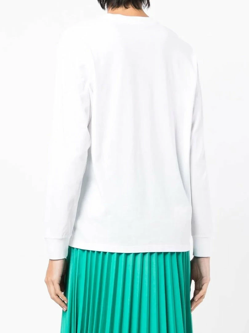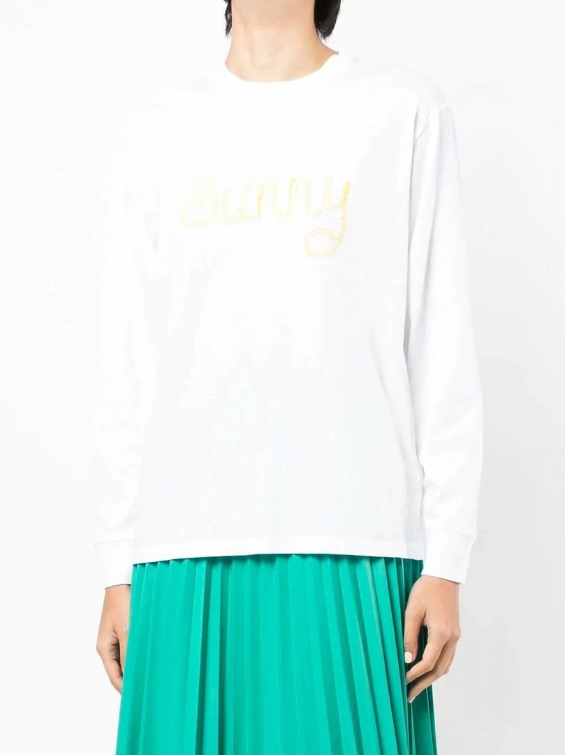 Bella Freud white ‘Sunny’ top featuring a round neck, long sleeves with ribbed cuffs, a yellow embroidered ‘Sunny’ design on the front and a pull on style. Item fits true to size. Model is wearing a size S.