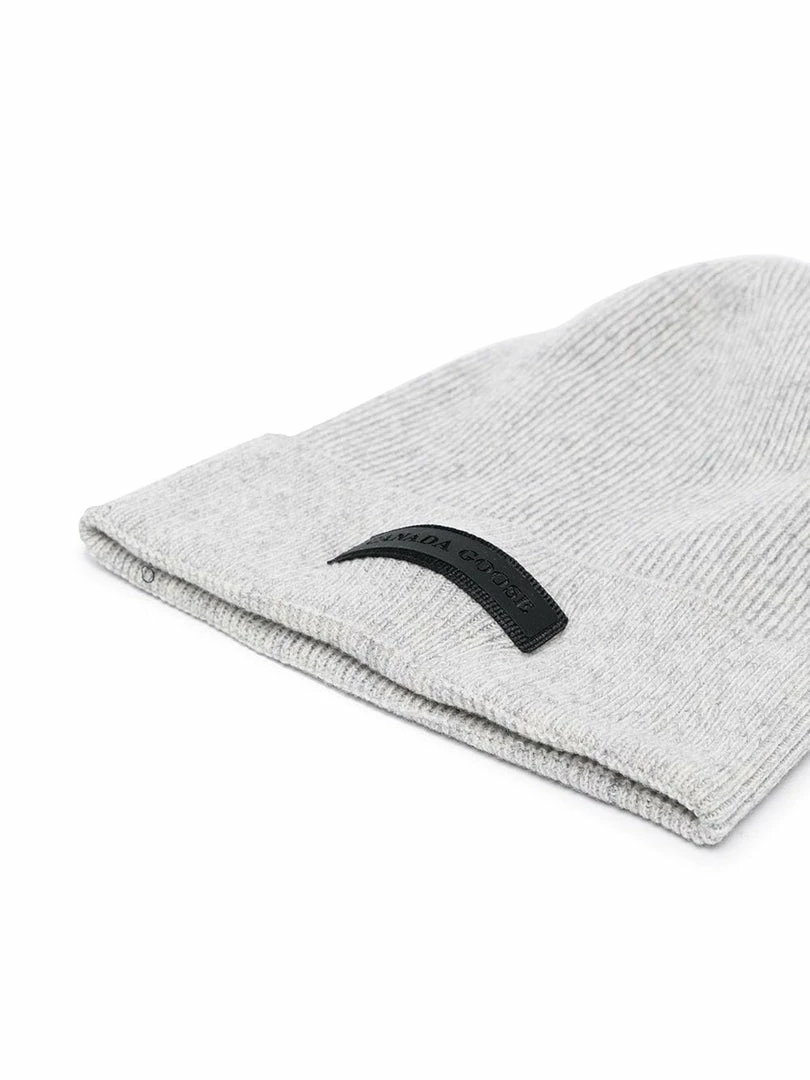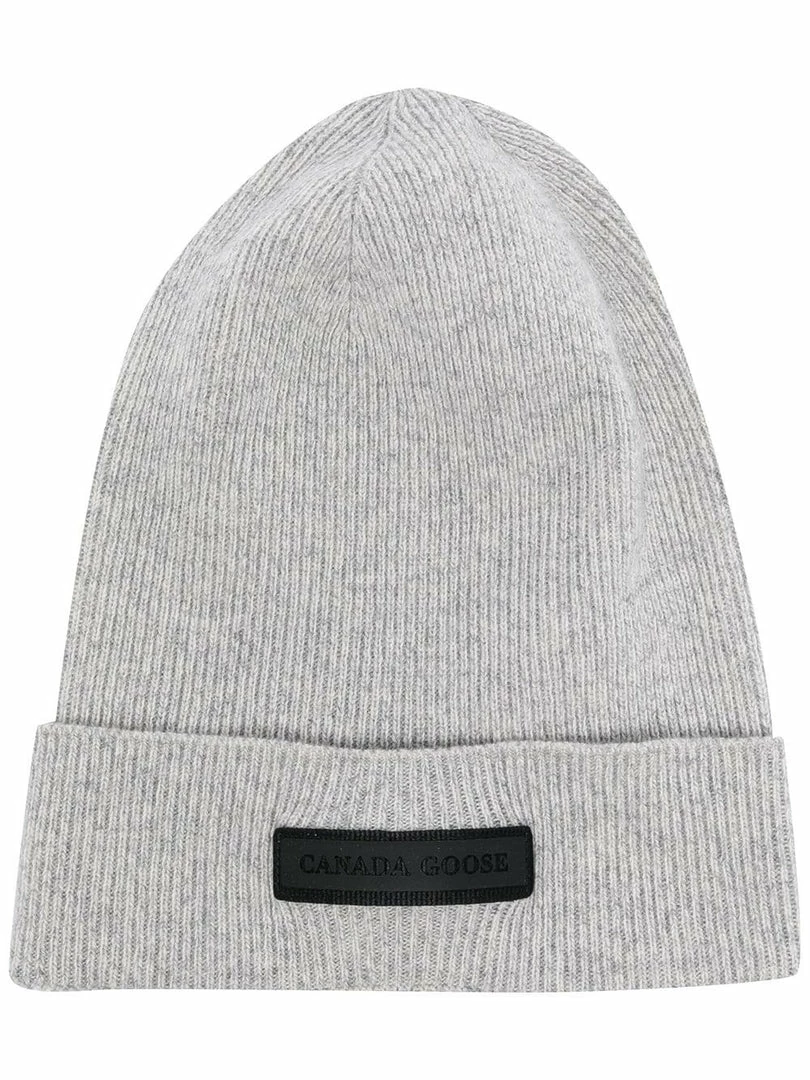 Canada Goose grey ‘Thin Ribbed Logo Detail Beanie’ featuring a black front logo patch, a knitted design, a rolled up hem and pulls on. Made in Italy. One Size.