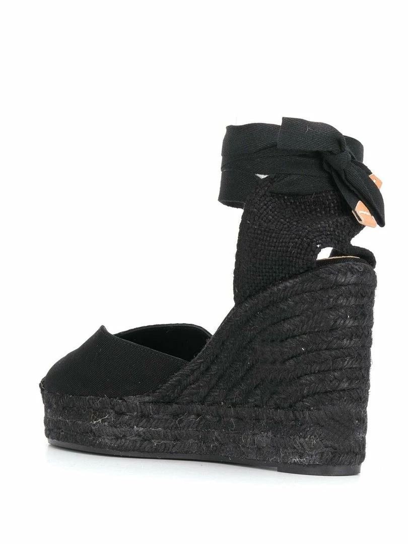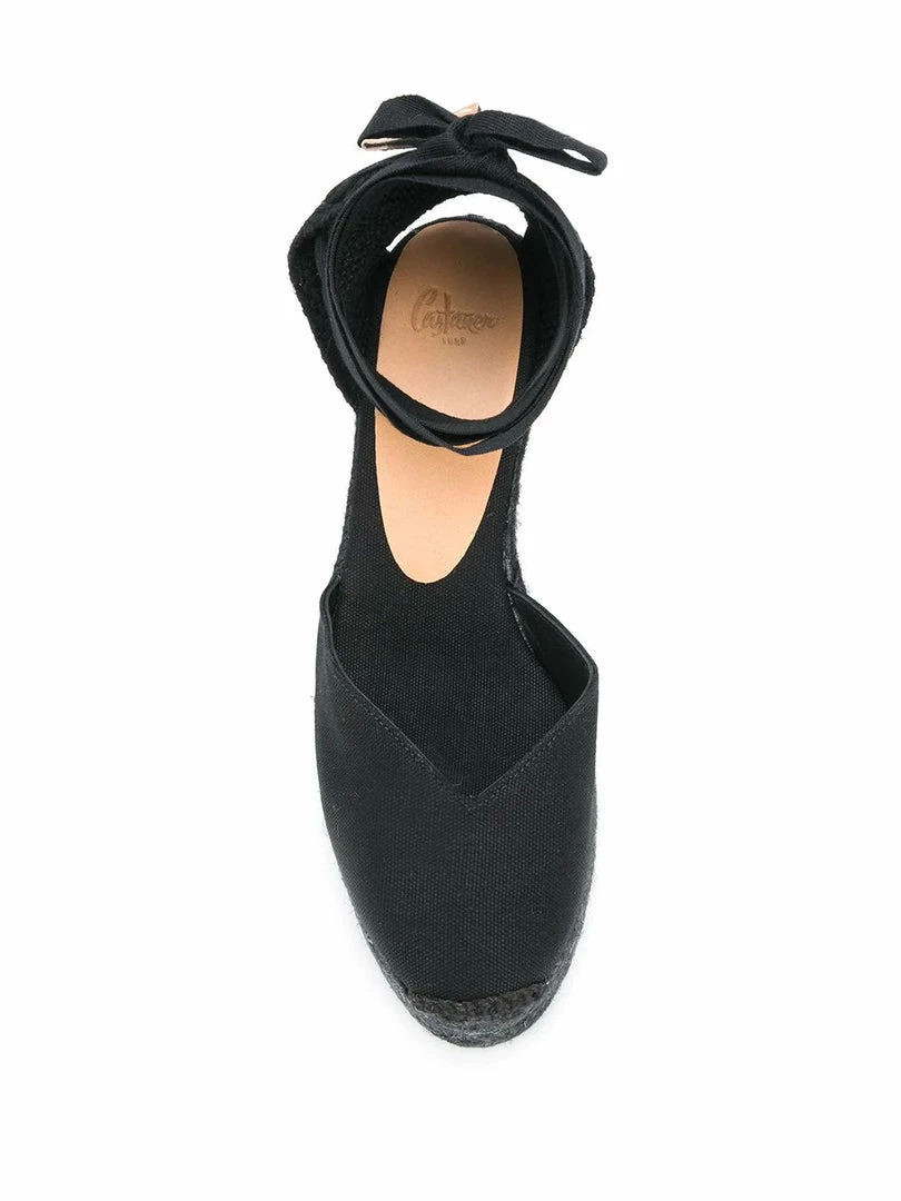 Castaner black ‘Chiara C 8ED’ espadrilles featuring a round toe, a branded insole, a small open heel back design, a tie up ankle fastening and a black wedged heel. Made in Spain. Item fits true to size. European Sizing.
