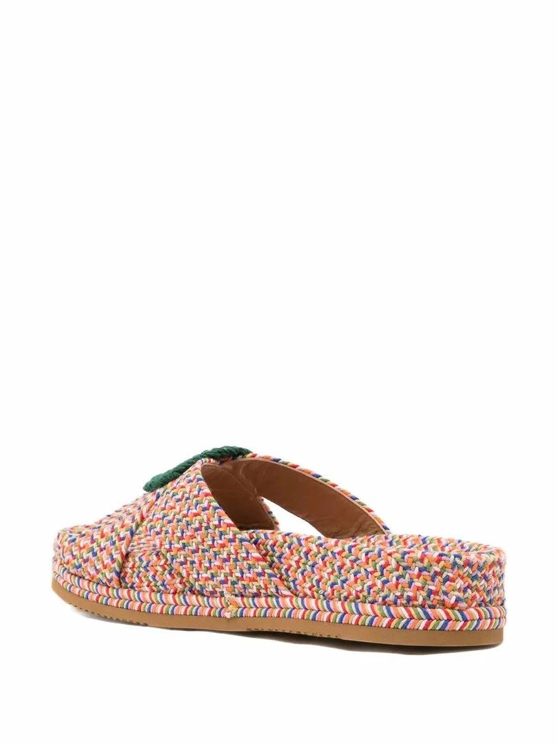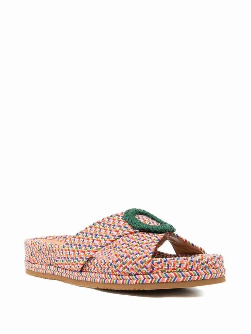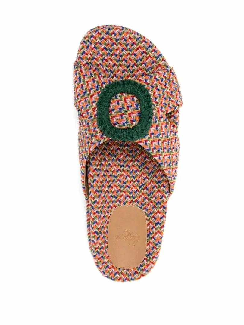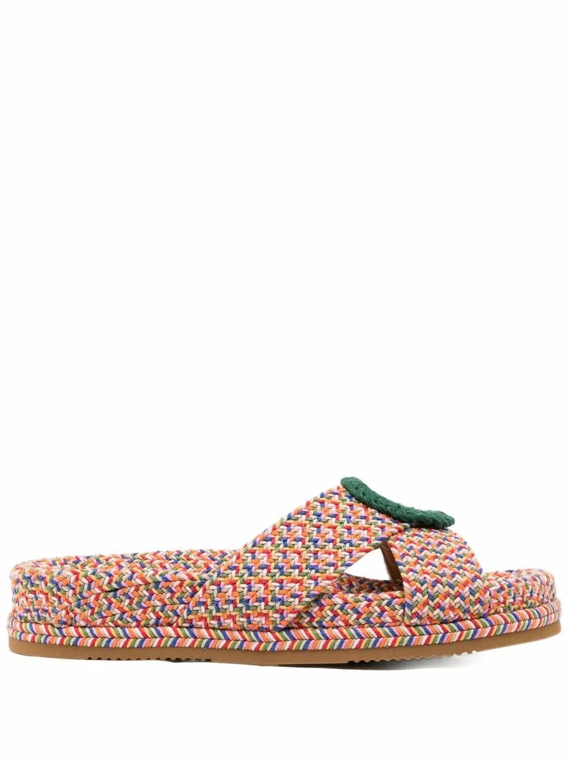 Castaner ‘Zuchi’ slides featuring an open toe, a green ring detail, a multicoloured braided cord design, a branded insole and a slip on style. Made in Spain. European Sizing. Item fits true to size.