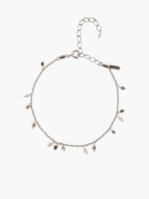 This delicate bracelet is composed of pyrite mix stones with sterling silver elements. Fastens with a spring ring clasp closure and extender chain. Handmade in Vietnam. Approx. 6″ – 8″ in length. Composed of Titanium pyrite, mystic labradorite and mystic smoky semi-precious stones, bronze shade SWAROVSKI® crystals and sterling silver elements.