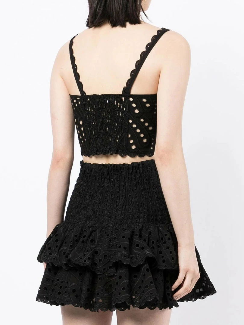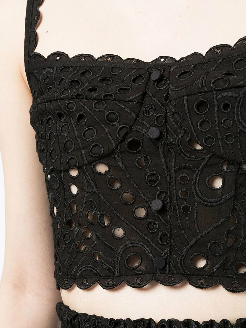 Charo Ruiz Ibiza black ‘Tessa’ crop top featuring thin straps, front button detailing, a concealed side zip fastening, a circular embroidered stitched design, panelled details, an elasticated gathered back, scalloped hems and a pull on style. Item fits true to size. Model is wearing a size S.