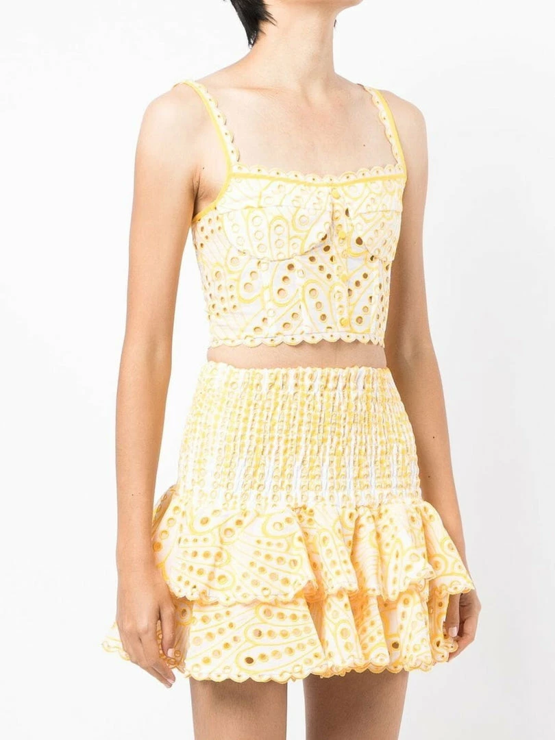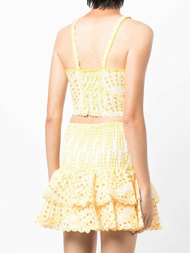 Charo Ruiz Ibiza yellow and white ‘Tessa’ crop top featuring thin straps, front button detailing, a concealed side zip fastening, a circular embroidered stitched design, panelled details, an elasticated gathered back, scalloped hems and a pull on style. Item fits true to size. Model is wearing a size S.