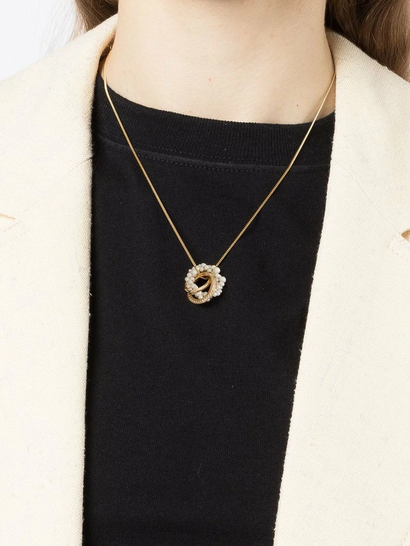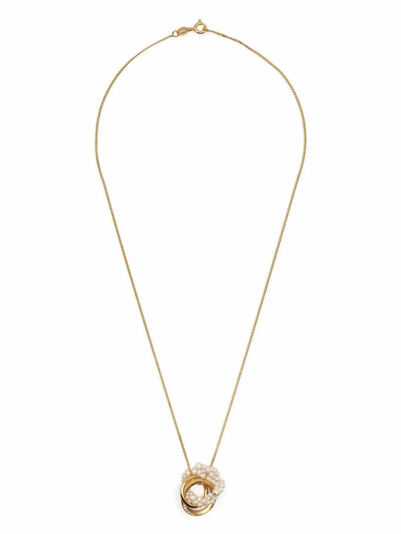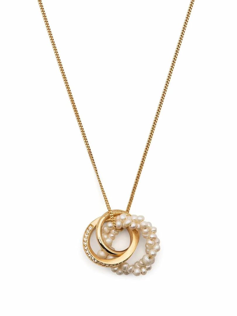 Completed Works gold vermeil ‘The Echoes Of A Time Of Solitude’ necklace featuring three circular pendants embellished with freshwater pearls and white topaz gemstones, a thin chain and a clasp fastening. Made in England. One Size.