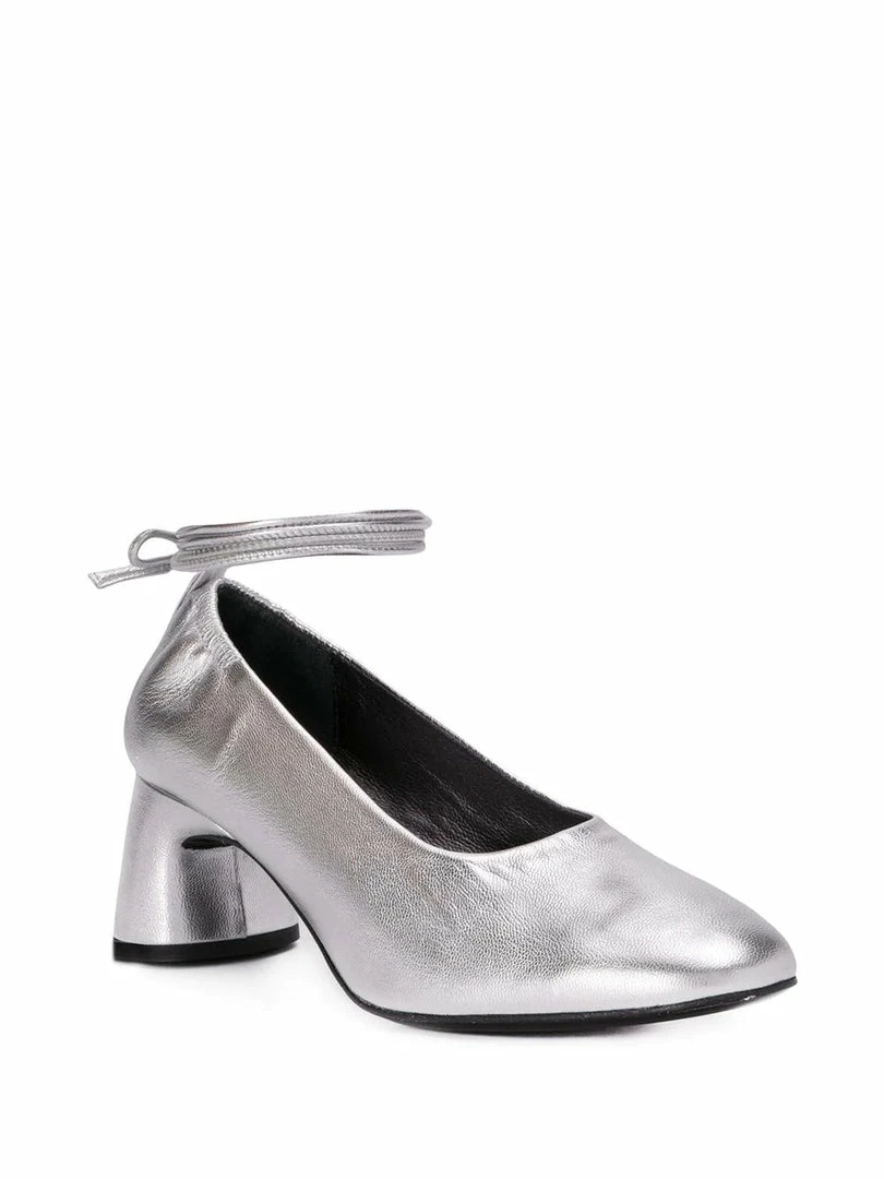Dorateymur silver ‘Heeled Pumps’ featuring a round toe, a branded insole, a lace up fastening around ankle and a mid high block heel. Item fits true to size.