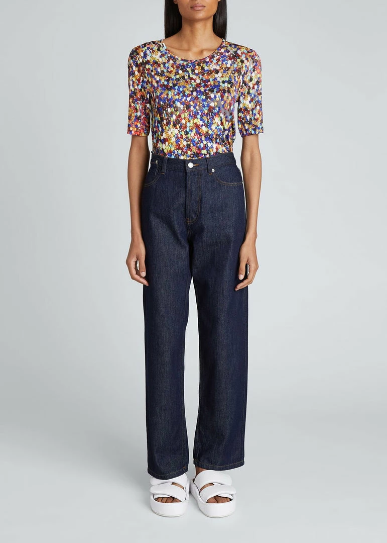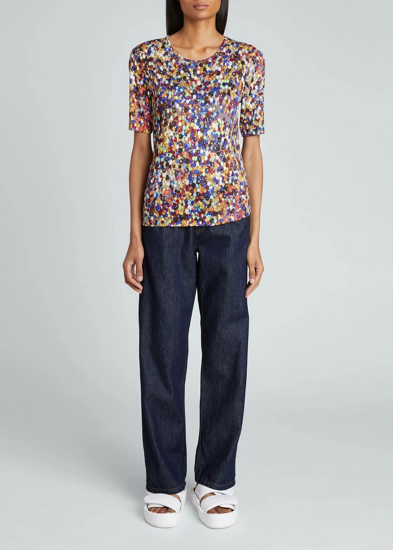 Dries Van Noten ‘Humbli’ T-shirt featuring a round neck, short sleeves, a multicoloured beaded print, a relaxed fit and pulls on. Item fits true to size. Model is wearing a size S.Â