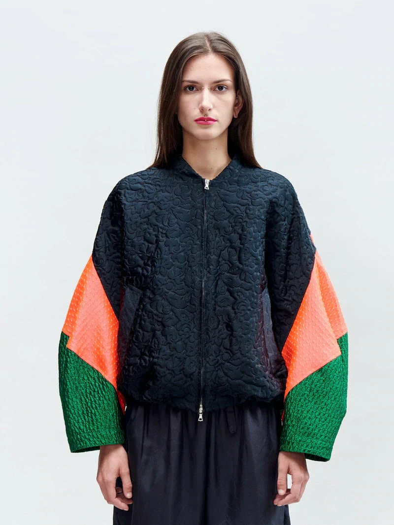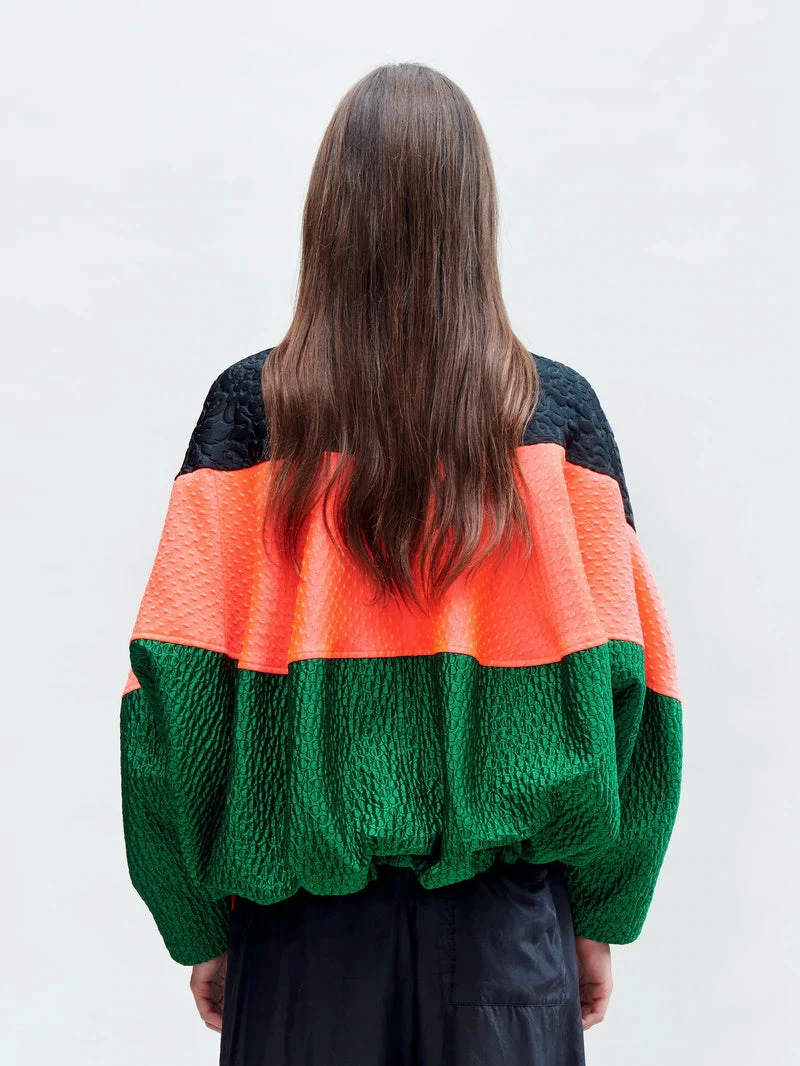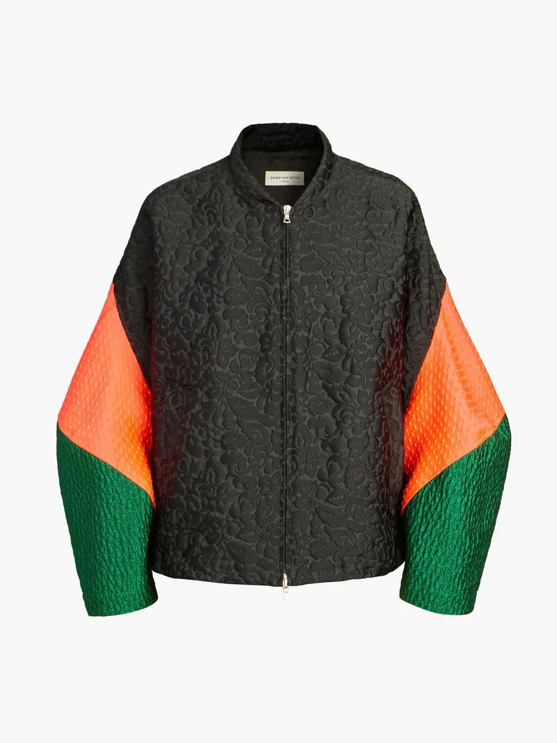 Dries Van Noten oversized ‘Vola’ bomber jacket featuring a front zip fastening, a black, green and neon orange jacquard block coloured design, front slip pockets, long sleeves and an inner drawstring hem. Model is wearing a size M.