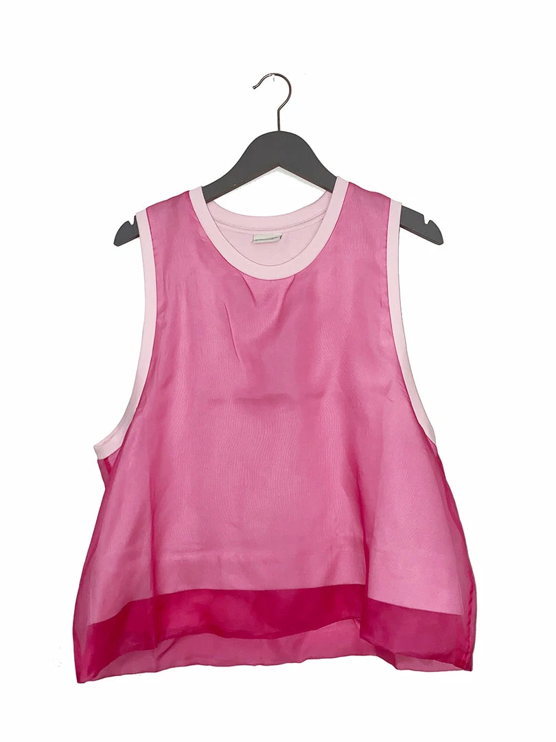 Dries Van Noten pink ‘Hanato’ sheer tank top featuring a round neckline, a sleeveless design, an A-line shape and pulls on. Item fits true to size.
