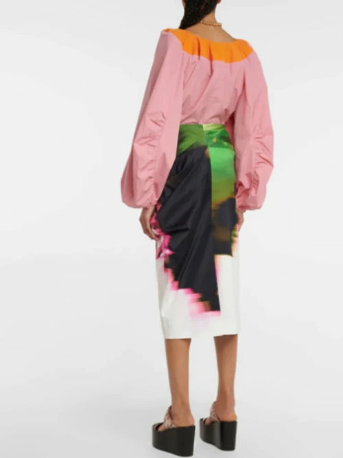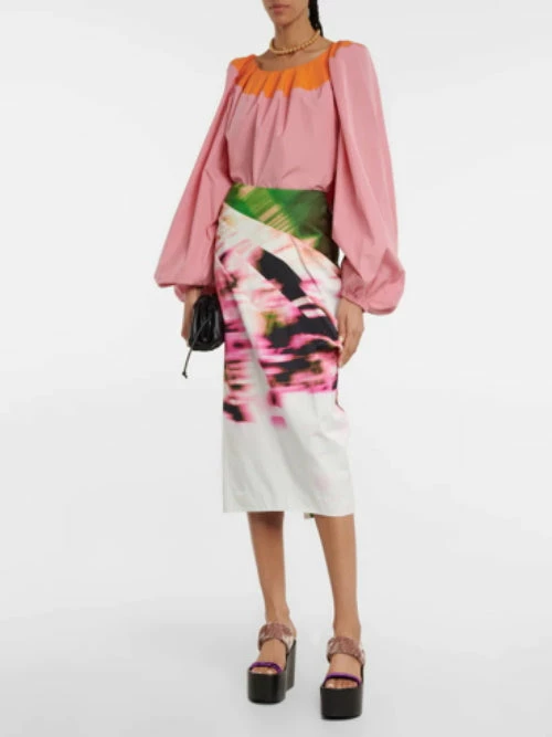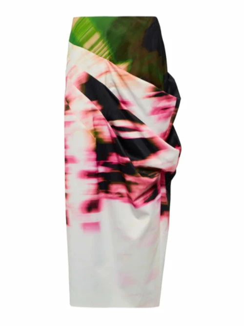 Dries Van Noten ‘Samy’ pencil skirt featuring a high rise fit, front diagonal pleat details with a draped design, a concealed back zip fastening, a multicoloured abstract print and a centre back slit. Item fits true to size. Model is wearing a size 38 FR.