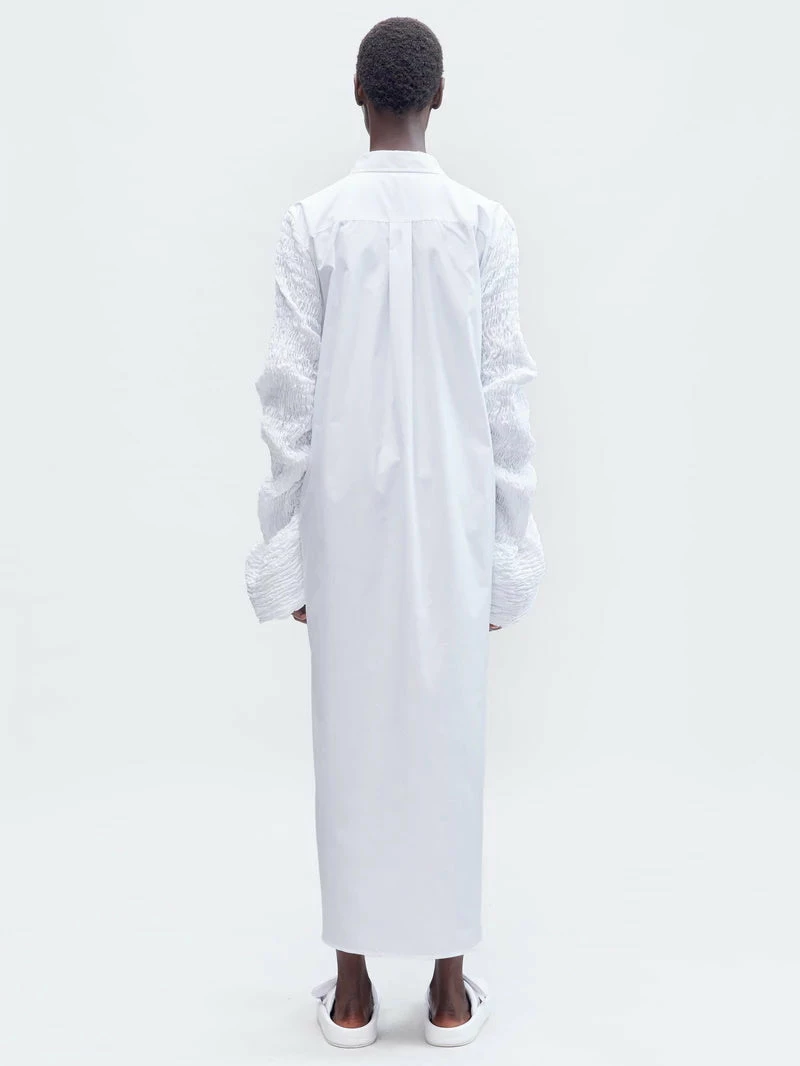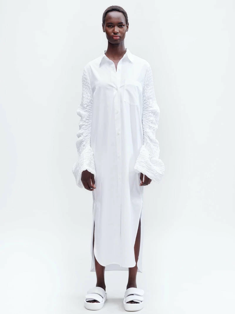 Dries Van Noten white ‘Dayla’ long shirt dress featuring a classic collar, front button fastenings, a front chest patch pocket, draped ruched and gathered smock sleeves with oversized cuffs, side buttoned pockets, a relaxed fit and side slits. Item fits true to size. Model is wearing a size S.