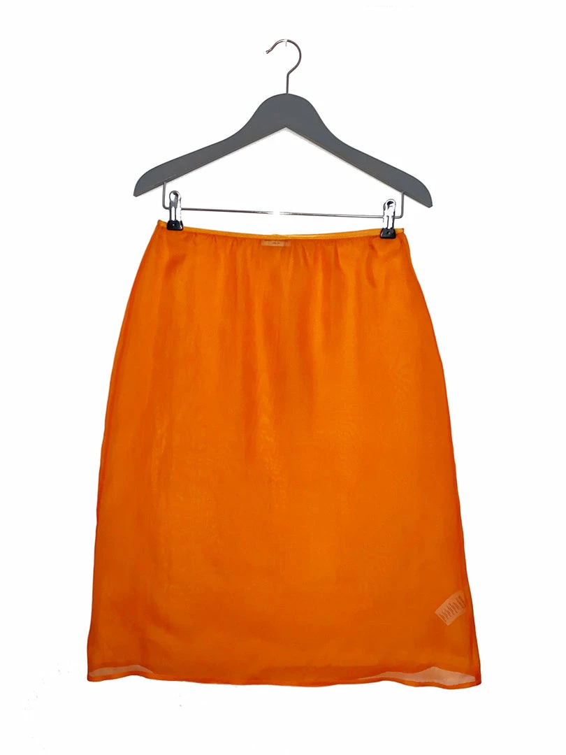 Dries Van Noten orange ‘Sola’ sheer midi skirt featuring an elasticated waistband, a midi length and pulls on. Item fits true to size.