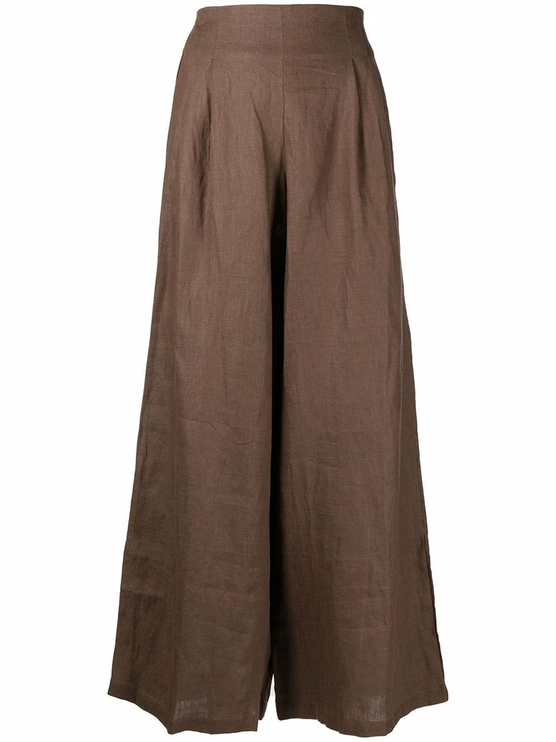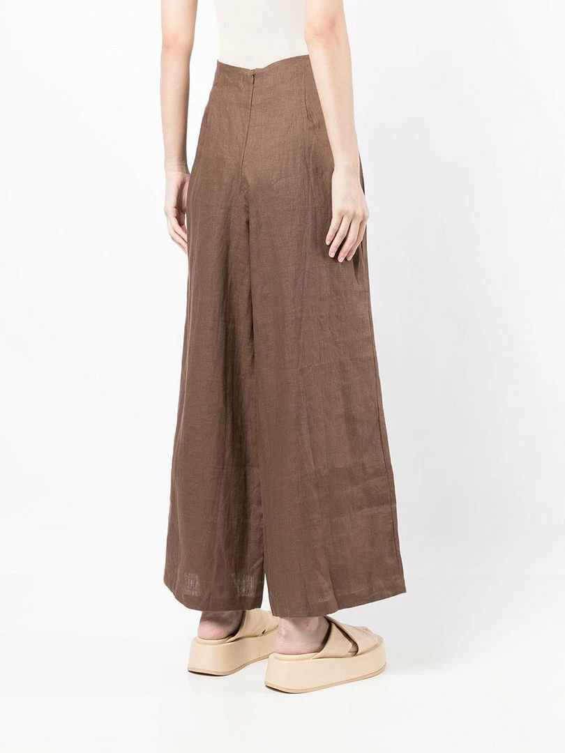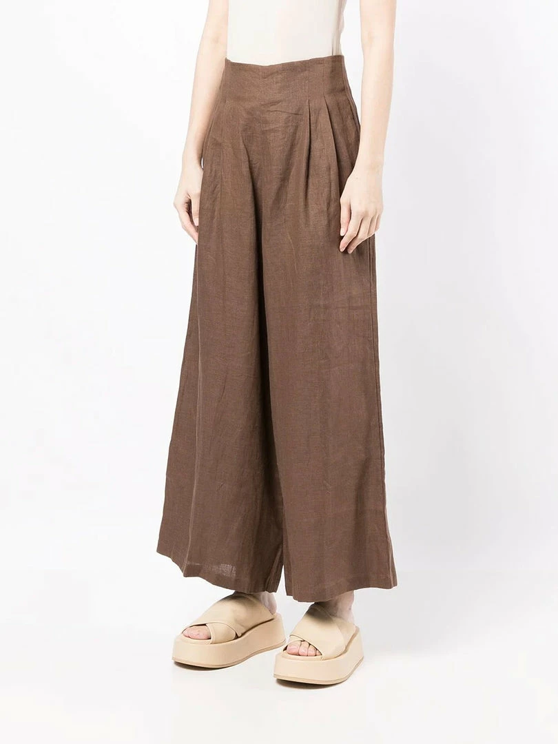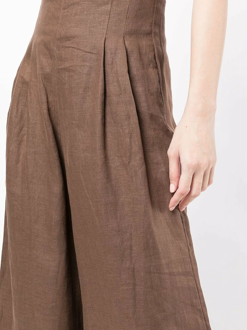 Faithfull The Brand brown ‘Malta’ wide leg trousers featuring a back zip fastening, pleated top details, a wide leg and a high waist style. Item fits true to size. Model is wearing a size S.
