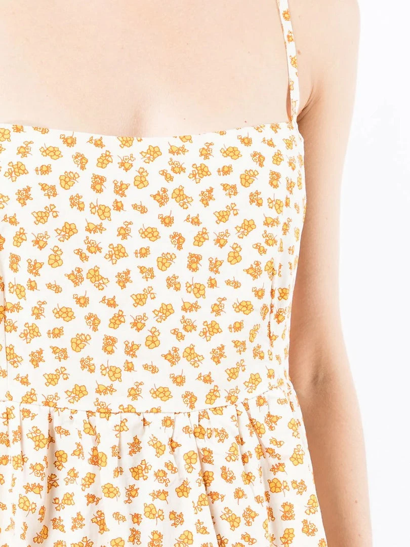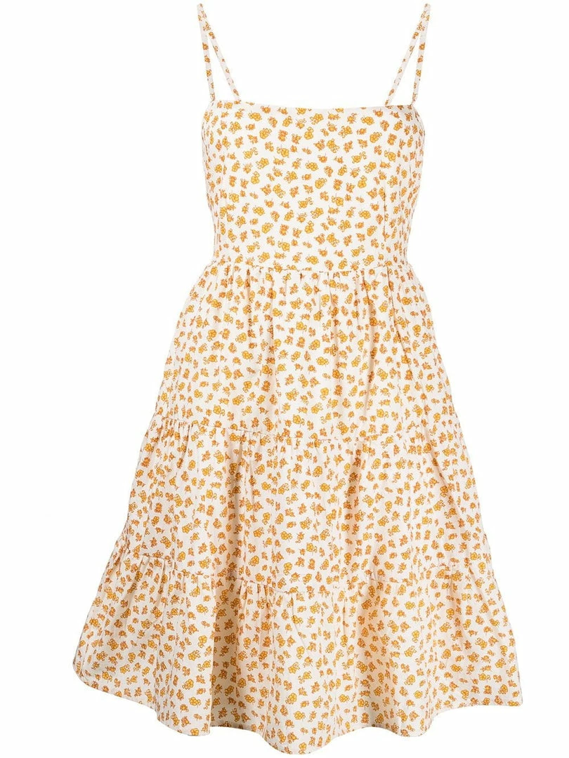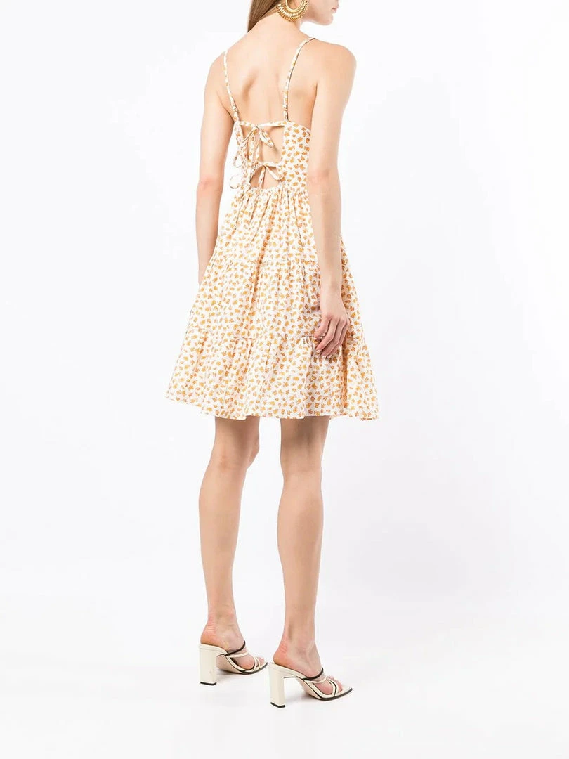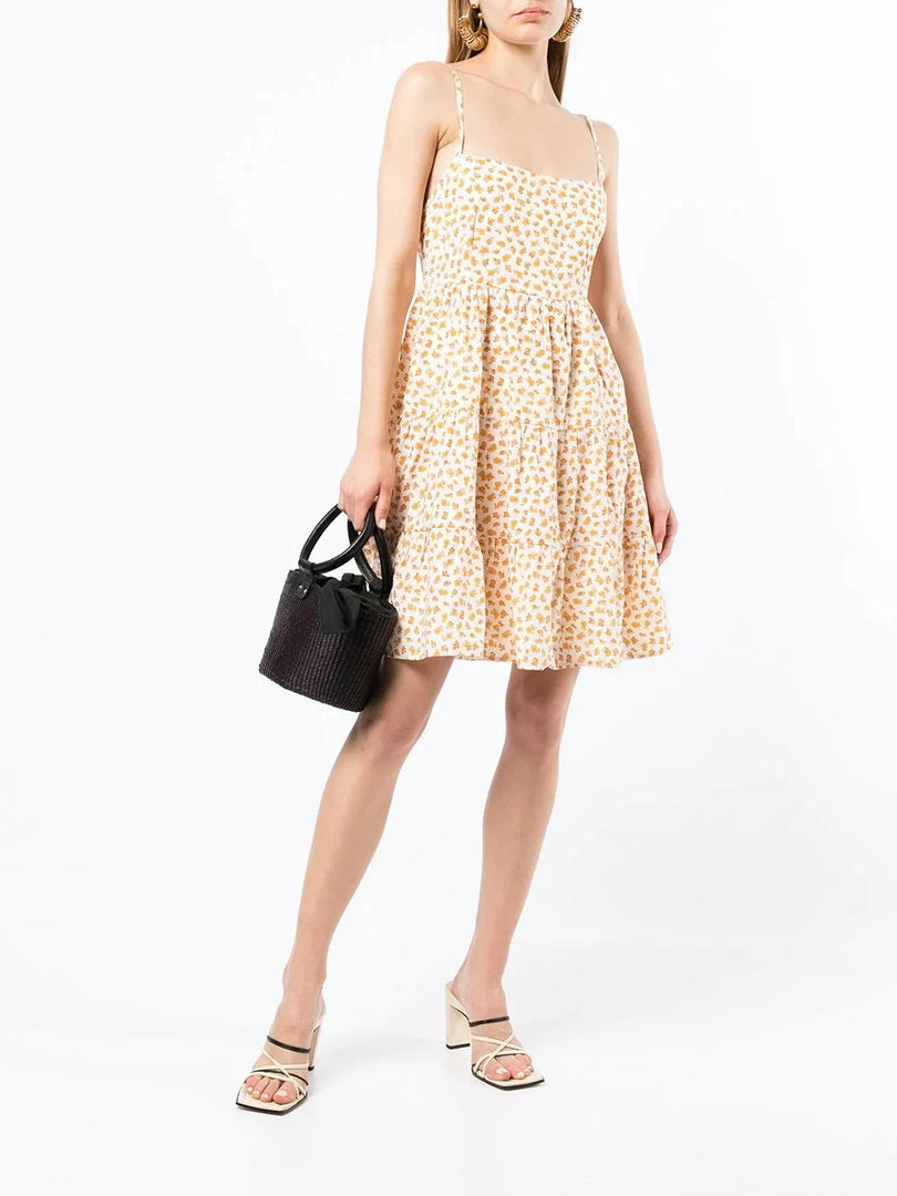 Faithfull The Brand cream ‘Cecelie’ floral motif mini dress featuring adjustable thin straps, back tie details, an elasticated back band, a high waist, a tiered skirt, a yellow floral motif print, a short length and pulls on. Item fits true to size. Model is wearing a size S.Â