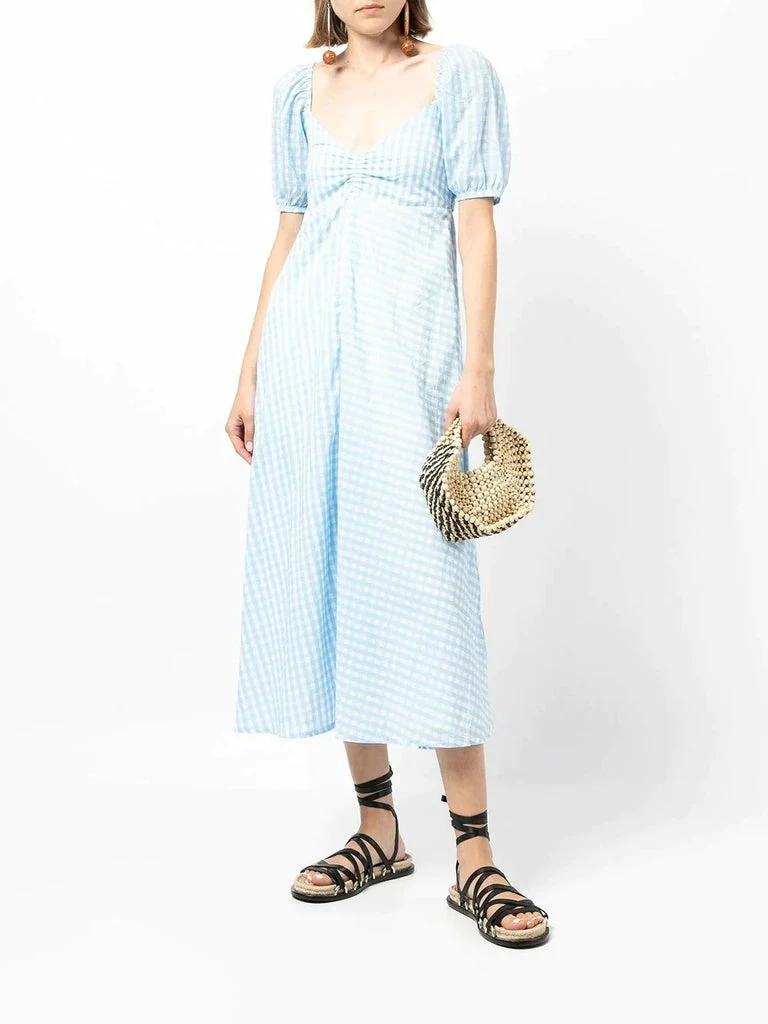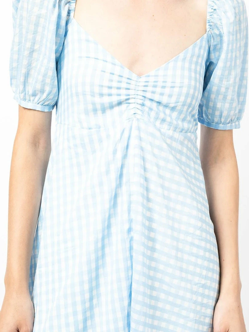 Faithfull The Brand ‘Charlize’ gingham midi dress featuring a V-neckline, elasticated shoulders, short sleeves, a gathered front detail, an empire waistline, a side zip fastening, a shirred back panel, a back bow detail, an A-line skirt, a blue and white gingham print and a midi length. Item fits true to size. Model is wearing a size S.Â