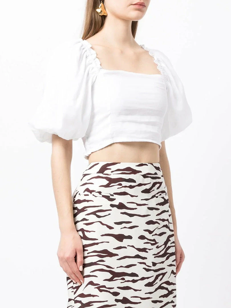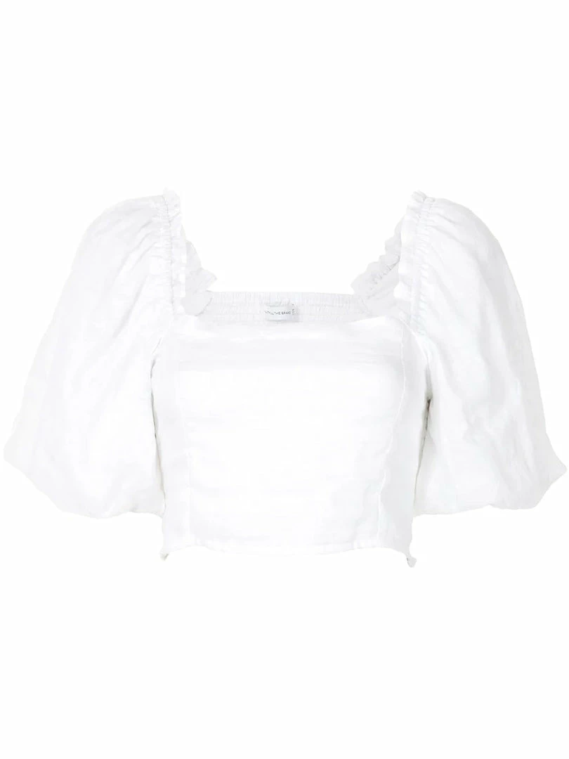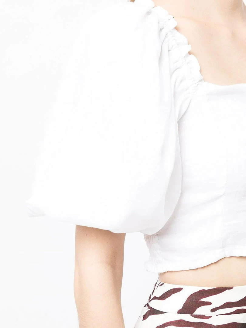 Faithfull The Brand white ‘Barnette’ linen crop top featuring a square neckline, ruffled shoulders, short puff sleeves with elasticated cuffs, a shirred back, a cropped fit and pulls on. Item fits true to size. Model is wearing a size S.
