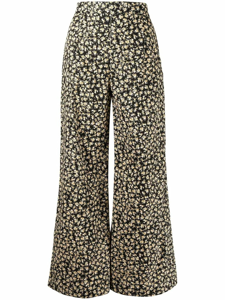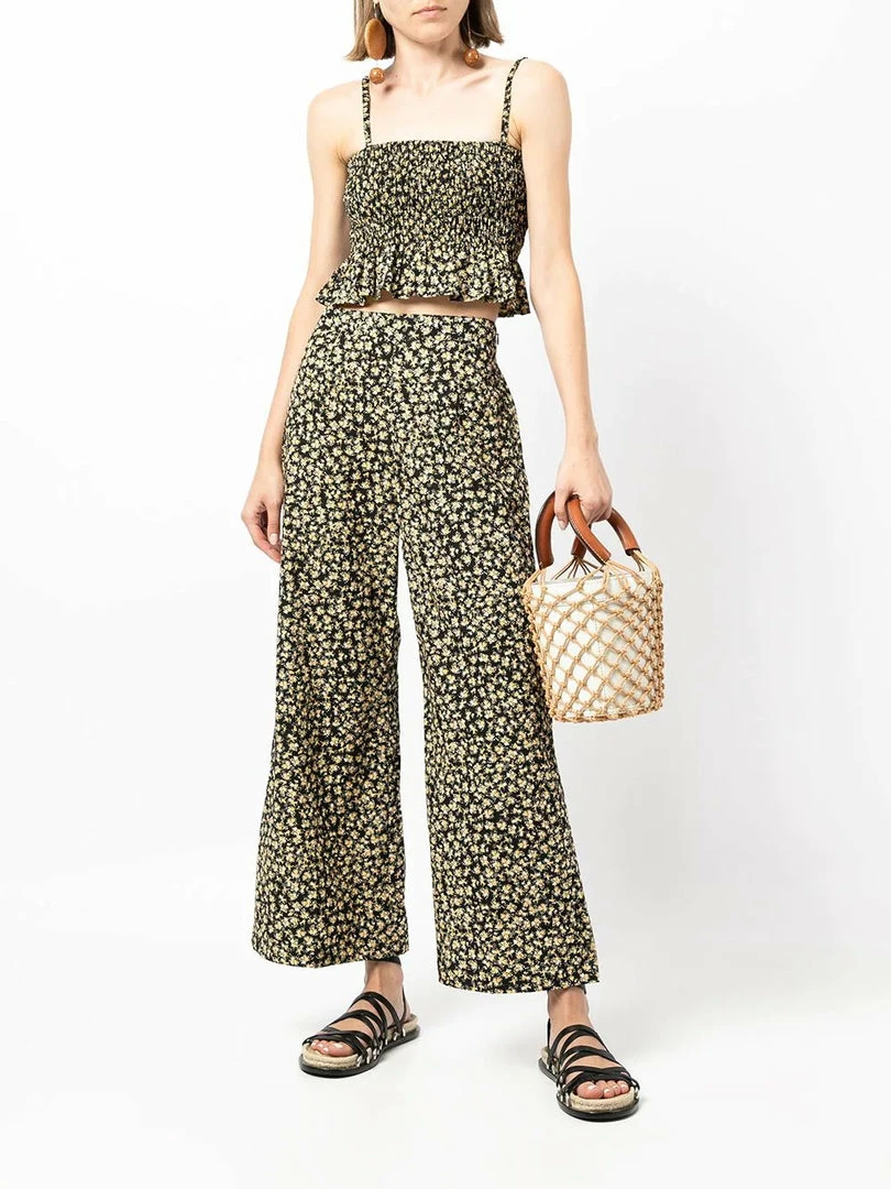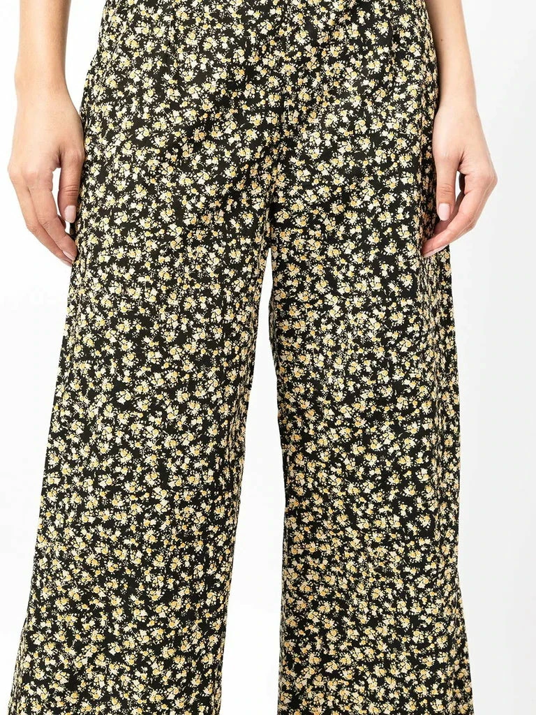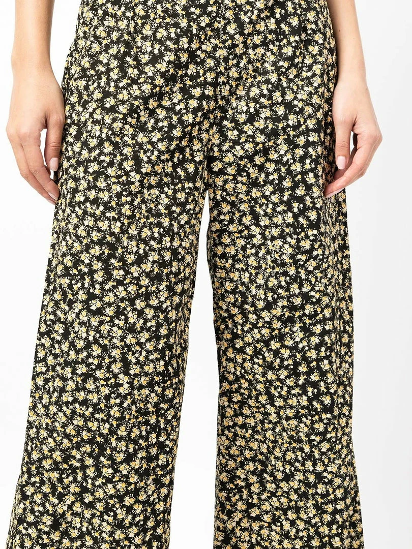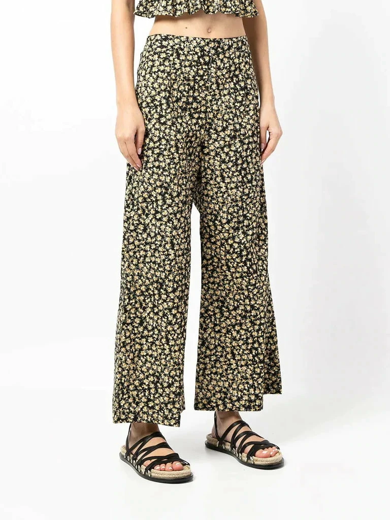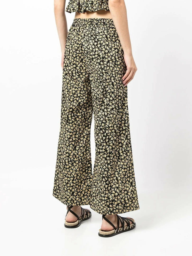 Faithfull The Brand black ‘Lario’ flared floral trousers featuring a side zip fastening, an elasticated back band, a flared leg and a yellow floral print. Item fits true to size. Model is wearing a size S.Â