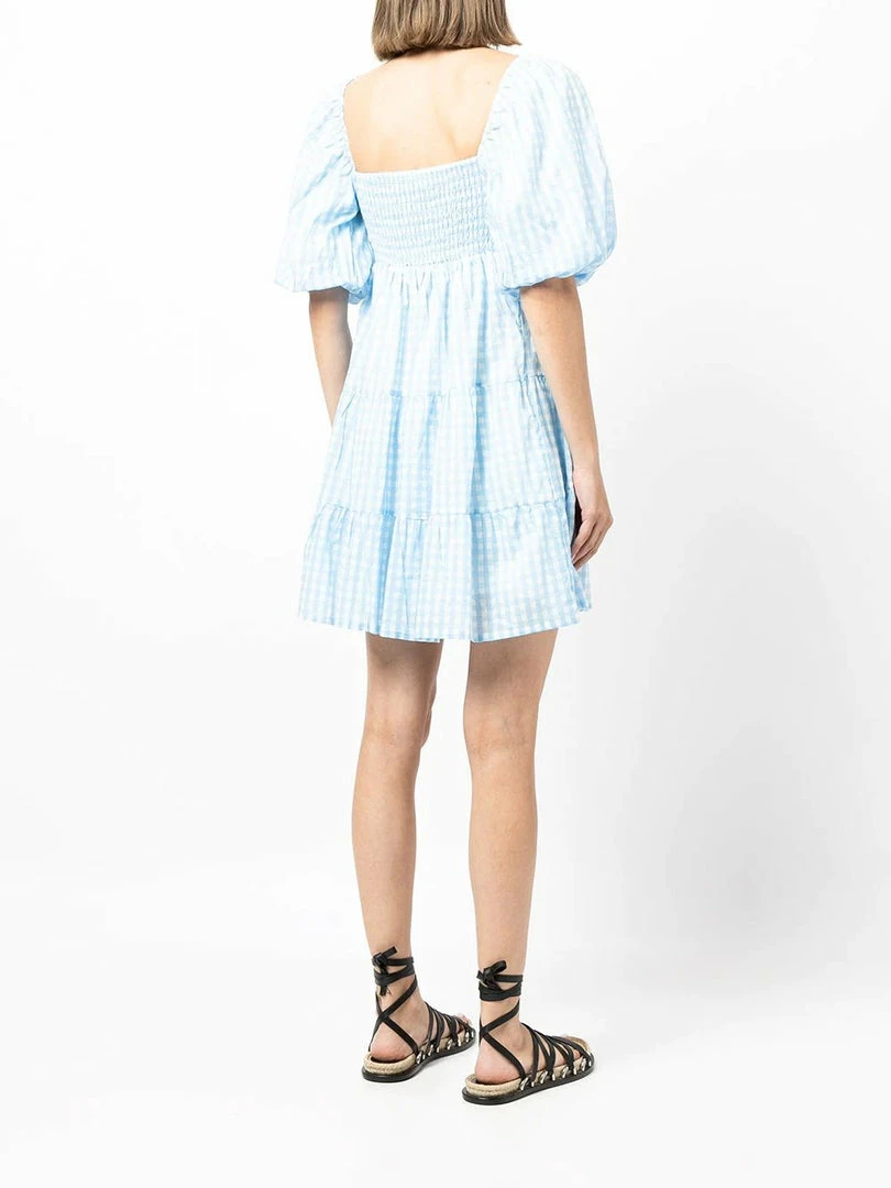 Faithfull The Brand ‘Leilani’ gingham mini dress featuring a square neckline, elasticated shoulders, short puff sleeves with elasticated cuffs, an empire waistline, a side zip fastening, a shirred back panel, a tiered skirt, a blue and white gingham print and a short length. Item fits true to size. Model is wearing a size S.Â
