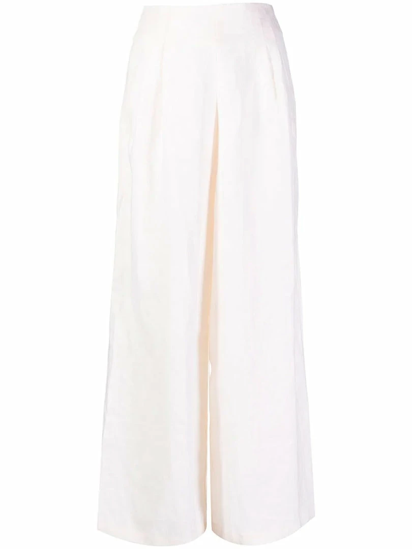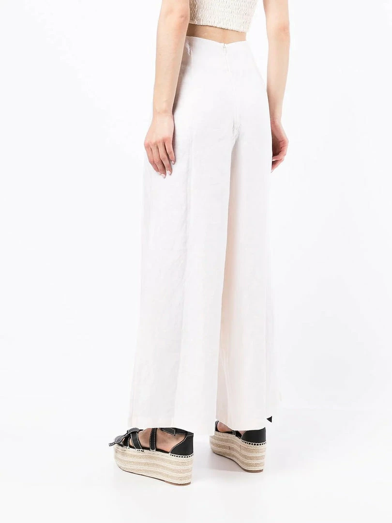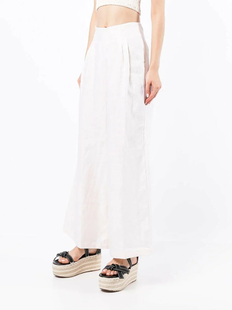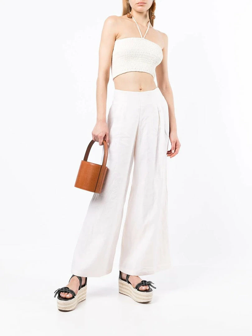Faithfull The Brand cream ‘Malta’ wide leg trousers featuring a back zip fastening, pleated top details, a wide leg and a high waist style. Item fits true to size. Model is wearing a size S.Â