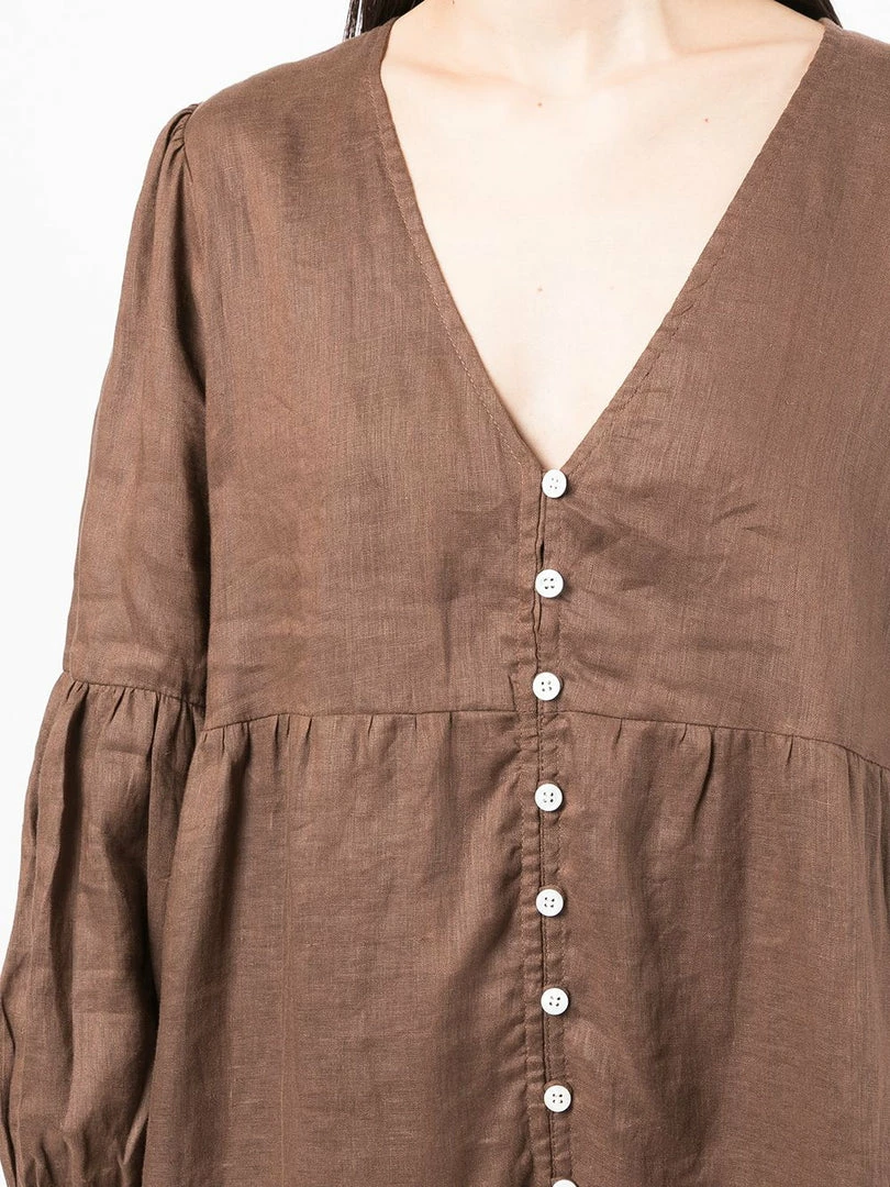 Faithfull The Brand brown ‘Dija’ buttoned mini dress featuring a V-neckline, front button fastenings, long sleeves with elasticated cuffs, a tiered skirt and a short length. Item fits true to size. Model is wearing a size S.Â